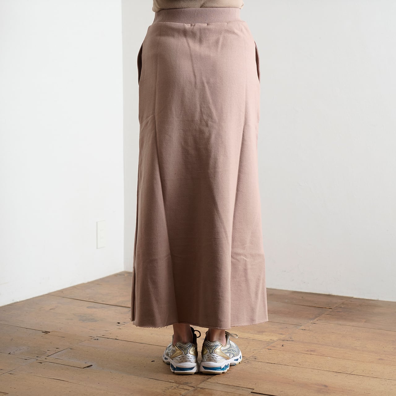 スウェットに使用される*裏毛を使用したマキシスカートです。エレガントなマキシスカートをスウェット素材でカジュアルに仕上げてあります。また裾は切りっ放しのカットオフ仕立てでカジュアル感を盛り上げます。(*裏毛:こちらはスウェット等に使われる裏地がループ状になっている素材です。決して毛ではありません。)