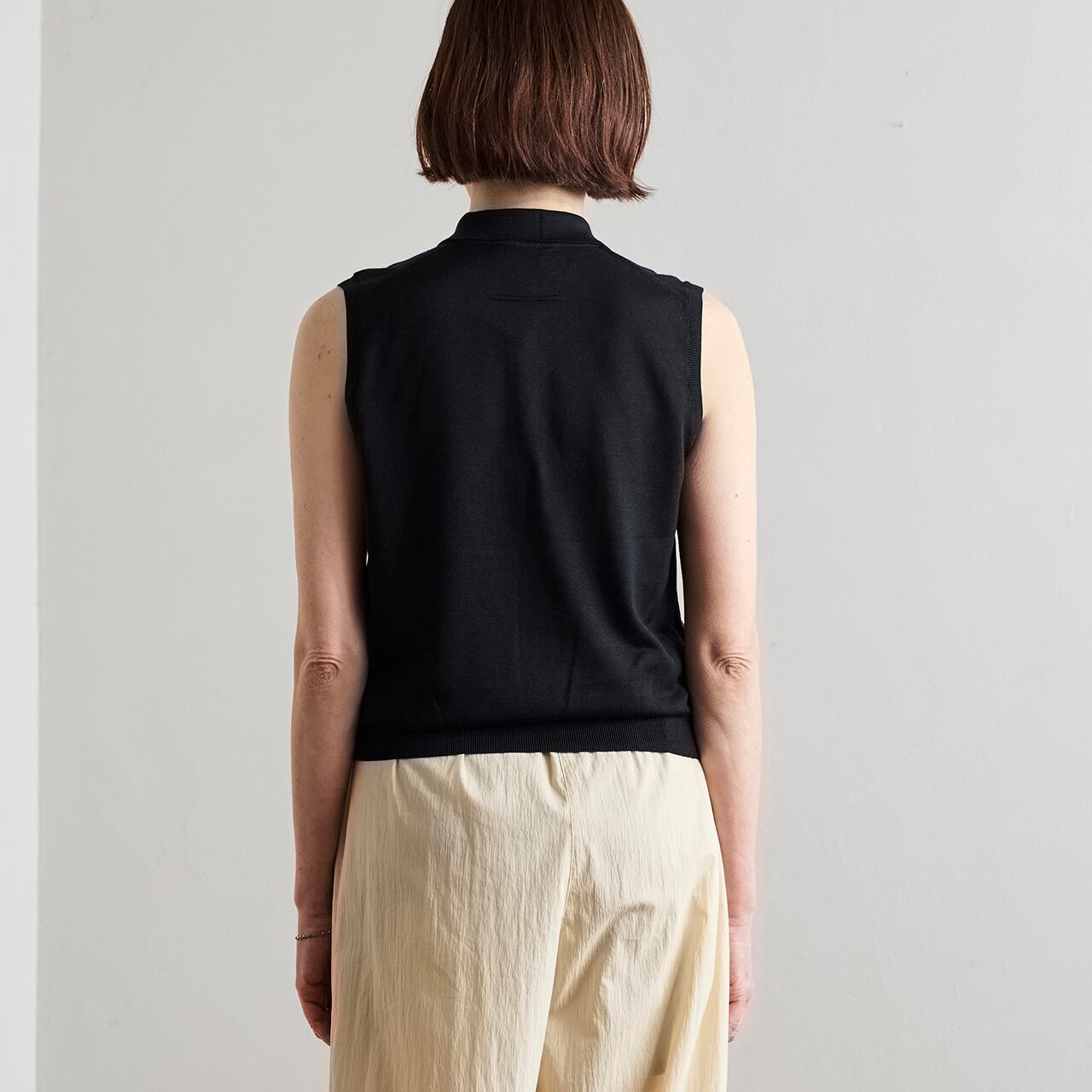 最高級のシルクを用い、18ゲージ天竺編みをフルファッション*で丁寧に編み立てたノースリーブポロ 。上品な光沢と滑らかな肌触り。