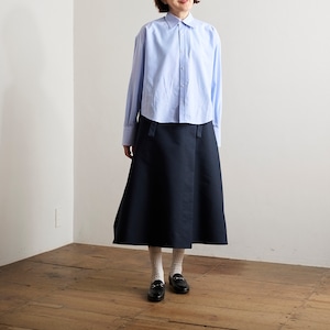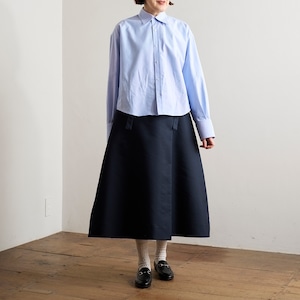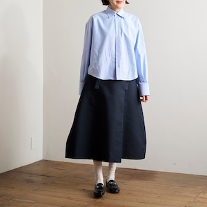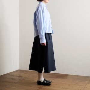 とてもシンプルなシャツは着丈が短めでユッタリした立体的なボックスタイプのボディにスッキリした袖に大きめの江里が印象的です。ボトムにはスカート、パンツと選ばず便利なアイテムです。