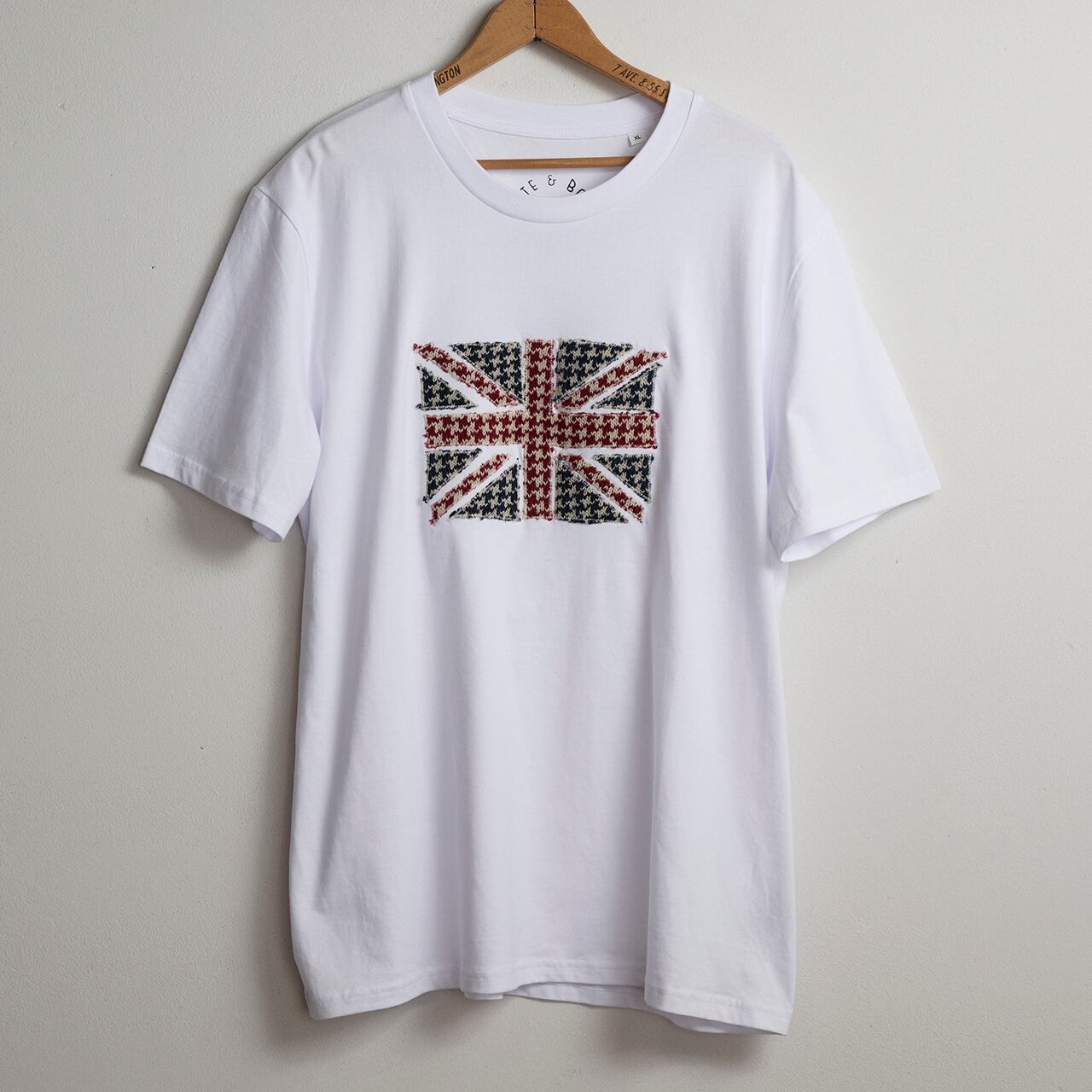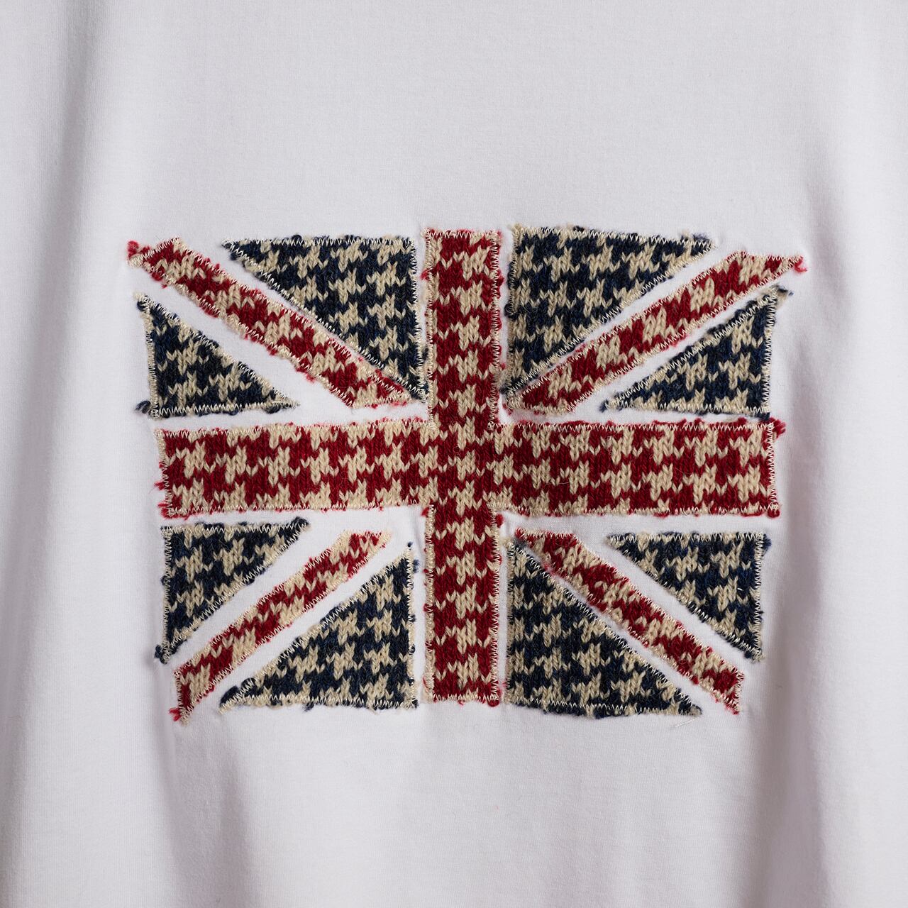 肌触りの良い柔らかなコットン素材のTシャツにニットの千鳥格子で作られたユニオンジャックがロンドンなイメージです。
