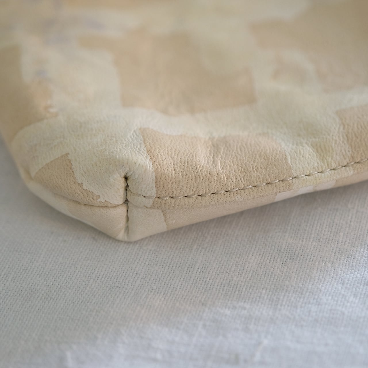 表面に残る傷や穴など、生きた跡をそのまま活かし、種を継いで育てる藍の生葉や季節ごとに咲く花を革に直接擦り付け模様を描いた壁掛けです。