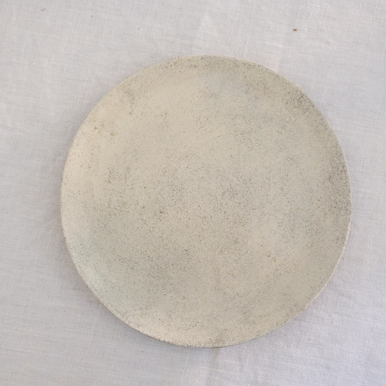 とてもシンプルな丸皿は灰釉の表情を素直に表現しています。焼き締めの器を焼く時に窯の中に残る「灰」を時間をかけて精製し、作り上げたオリジナルの灰釉薬を施した器です。薪窯、もしくは灯油窯で焼いています。