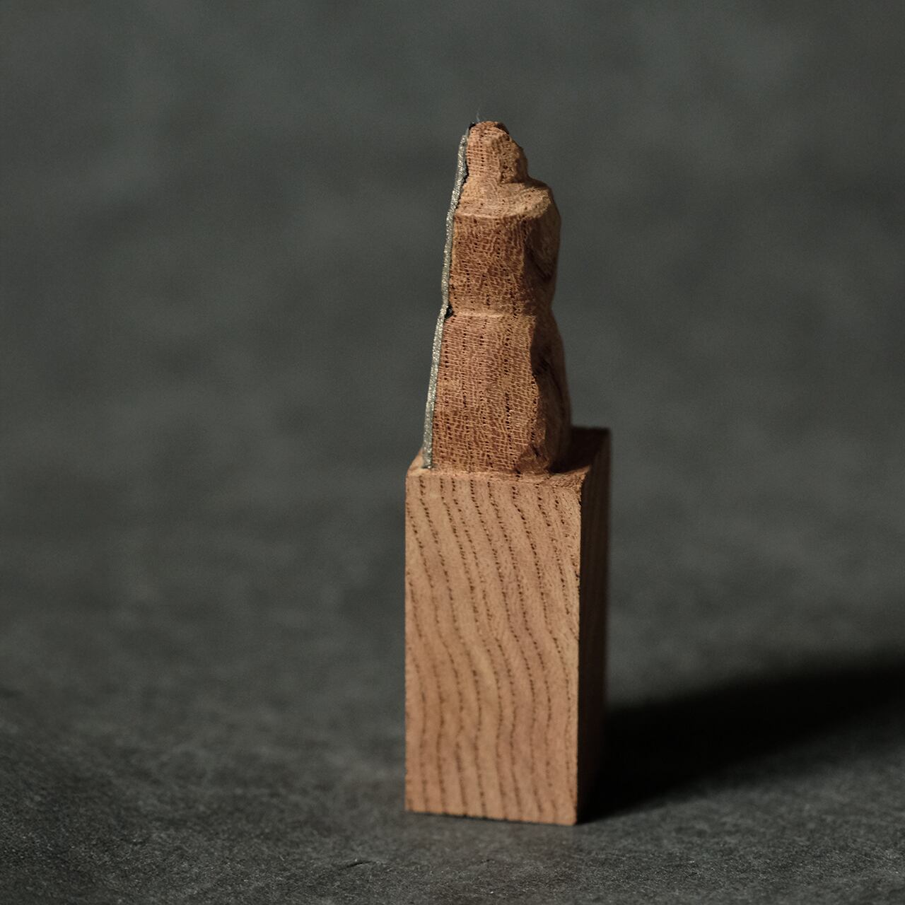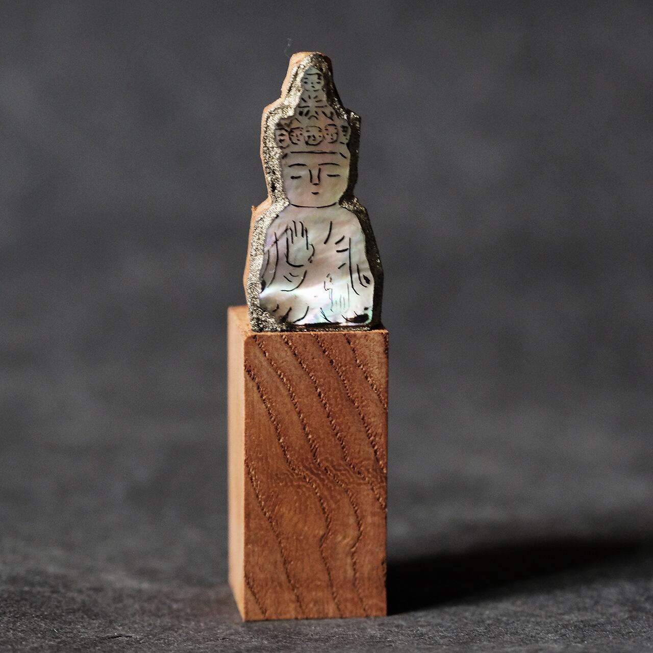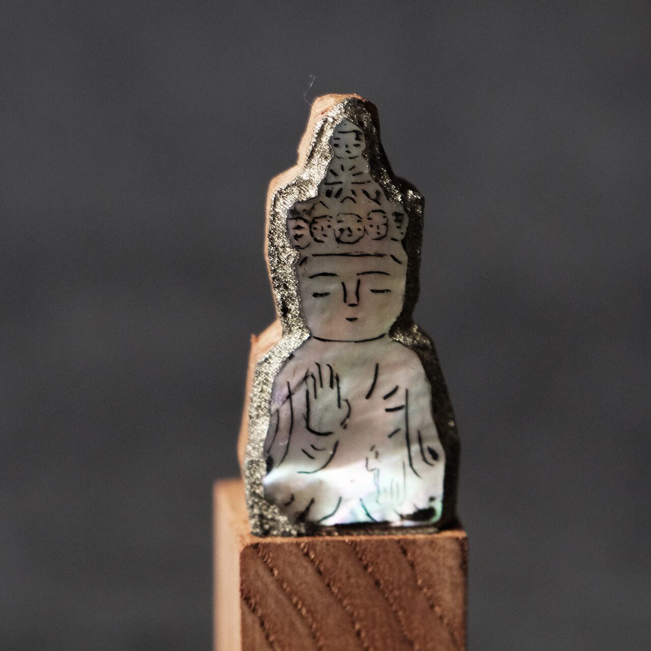 彫刻材としてよく使われる欅材に、アワビと錫粉で十一面観音さまを描いています。