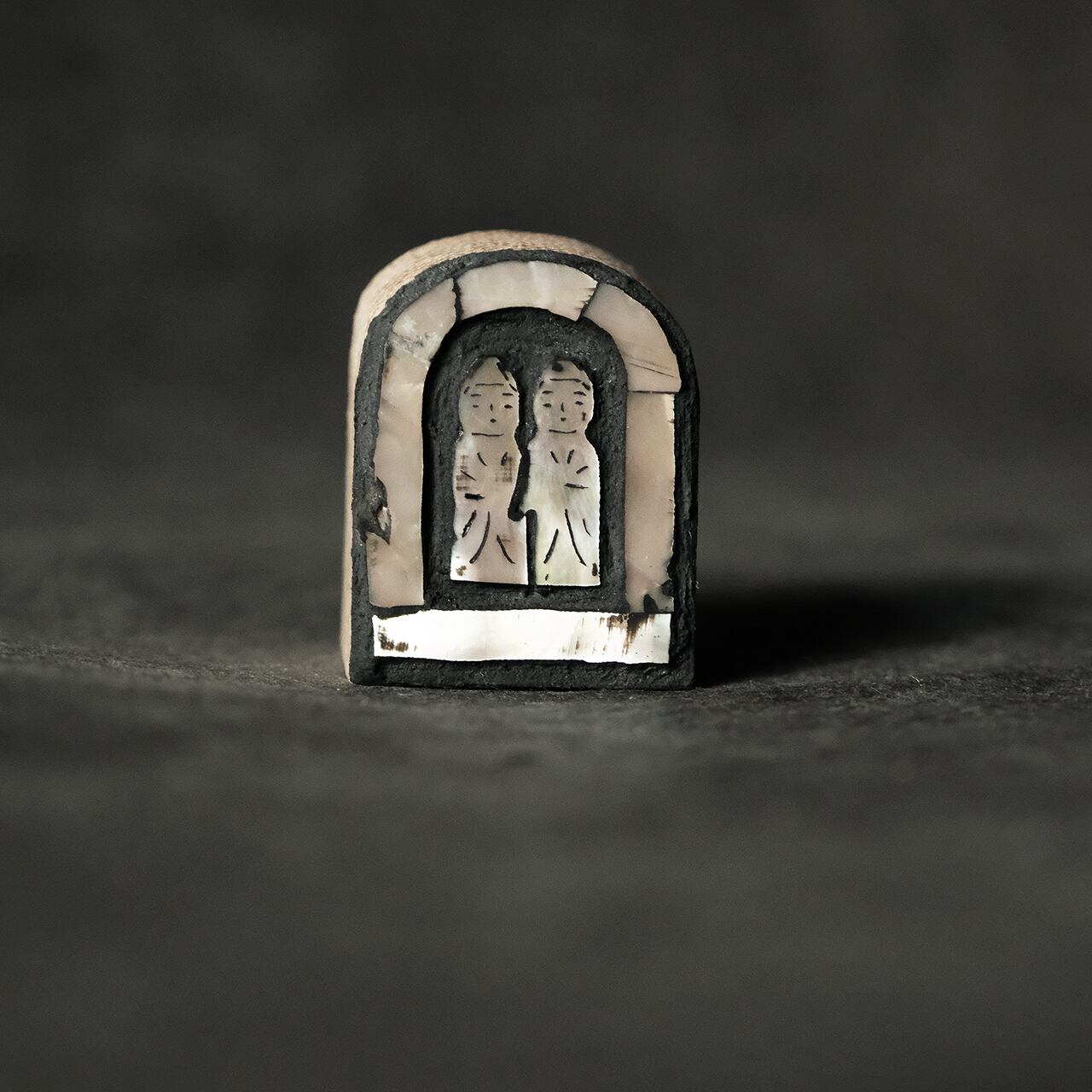 楢材に漆を塗り、アワビ貝で双体道祖神を描いています。