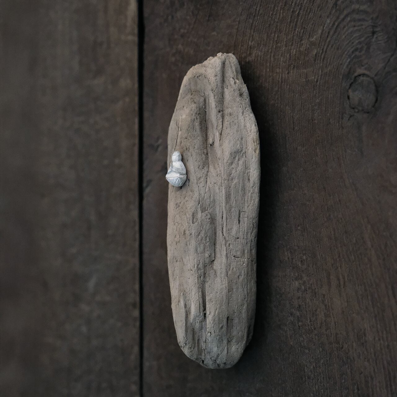 流木にシルバーで制作した仏を組み合わせた作品です。とても細かで精緻な仏さまは三輪さんならではの作風となっています。