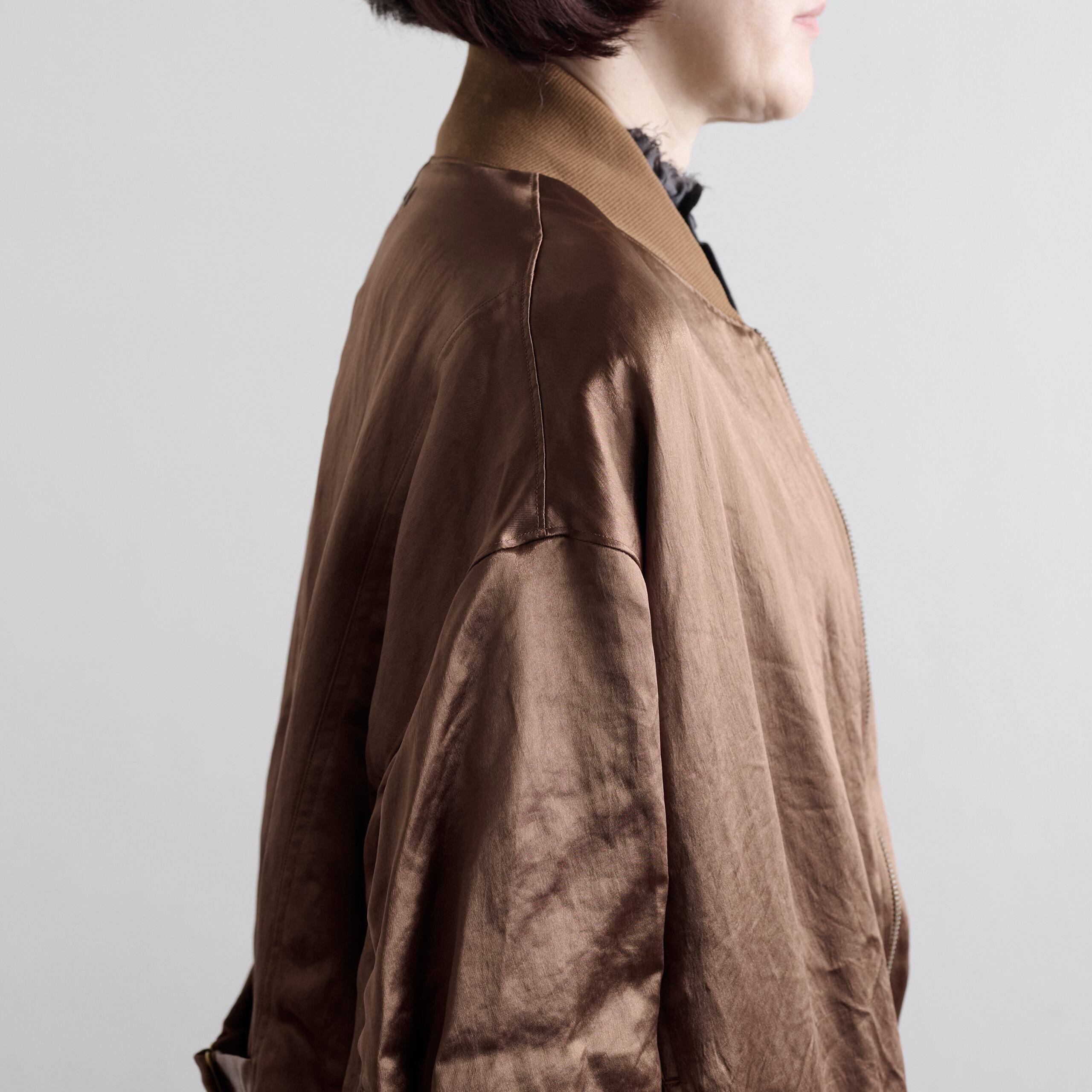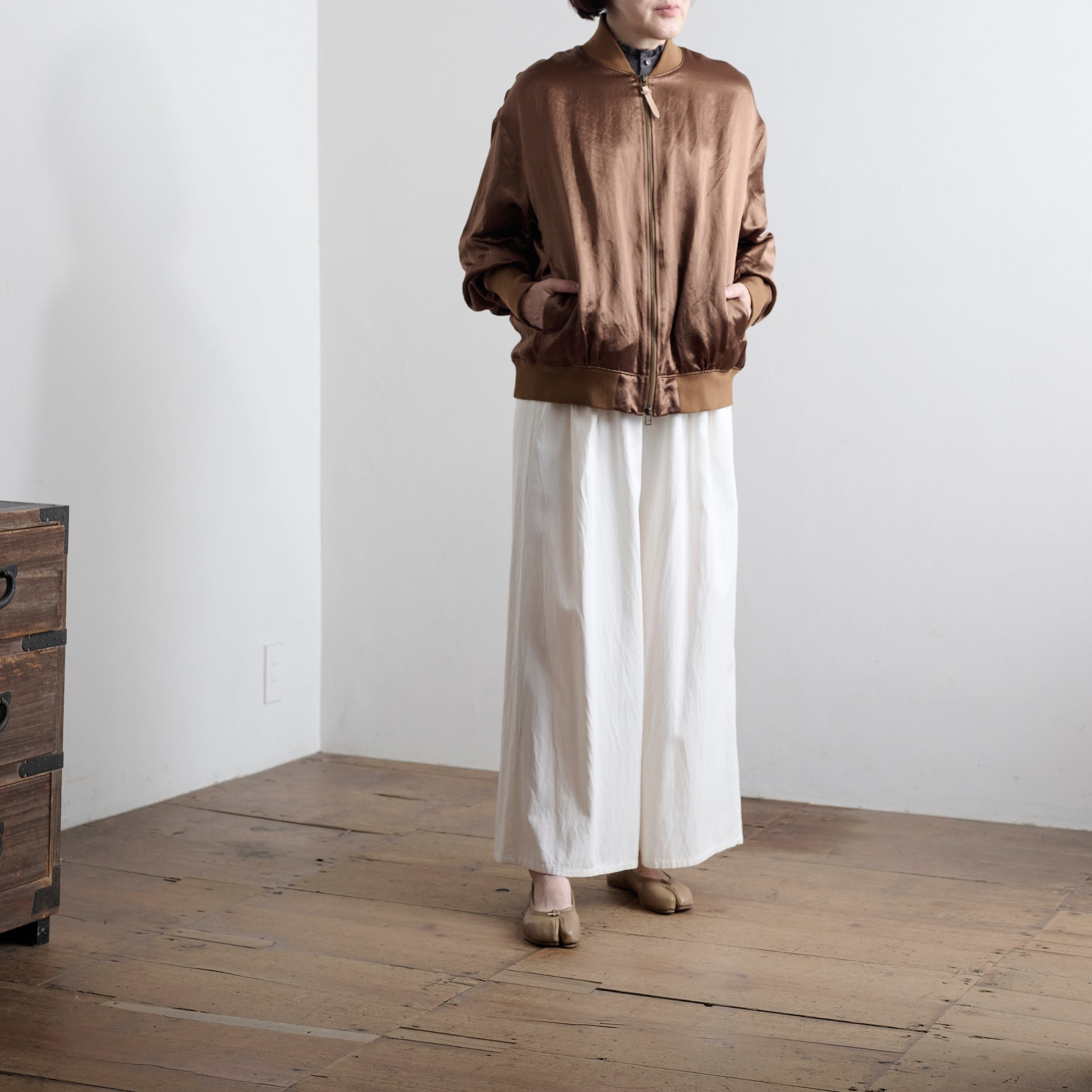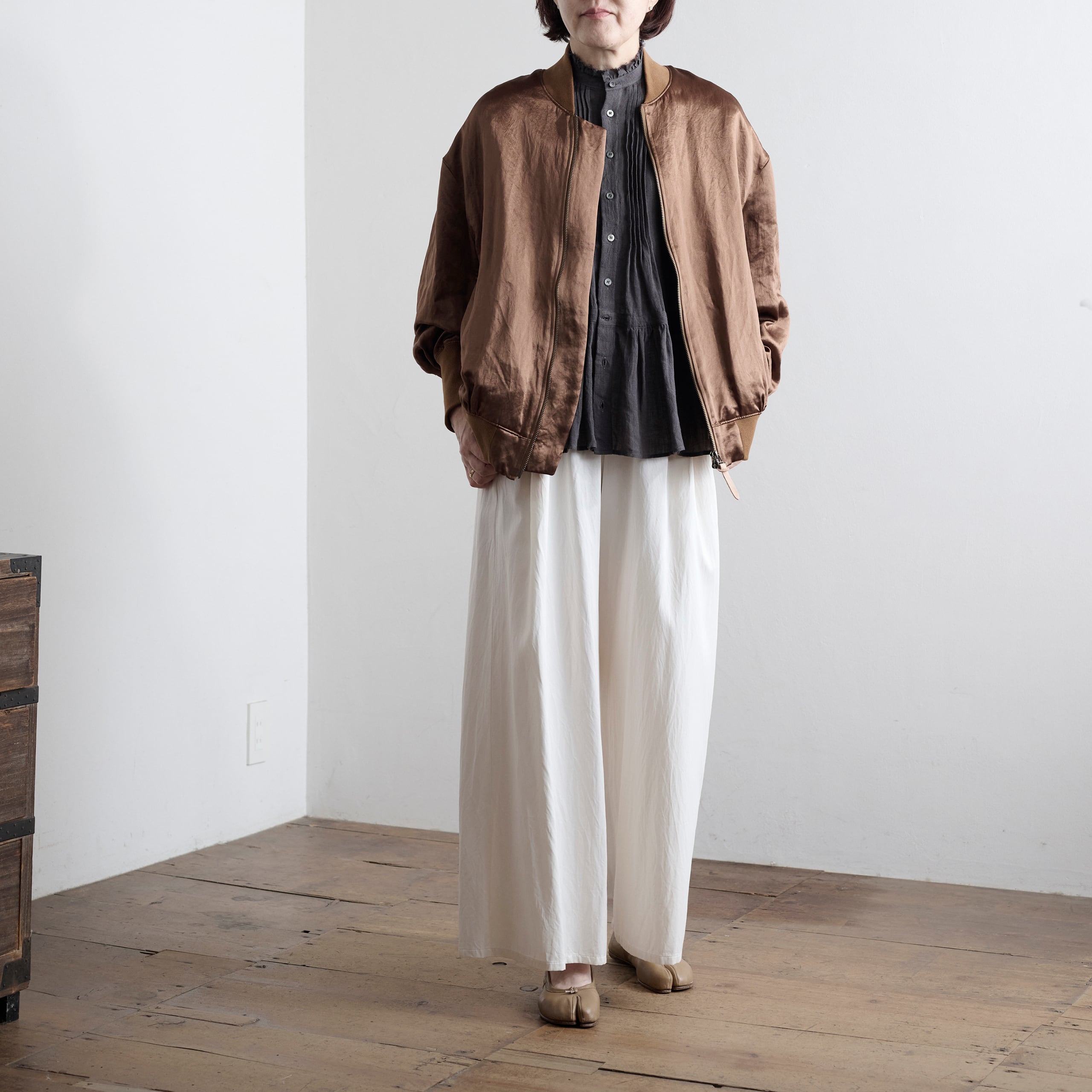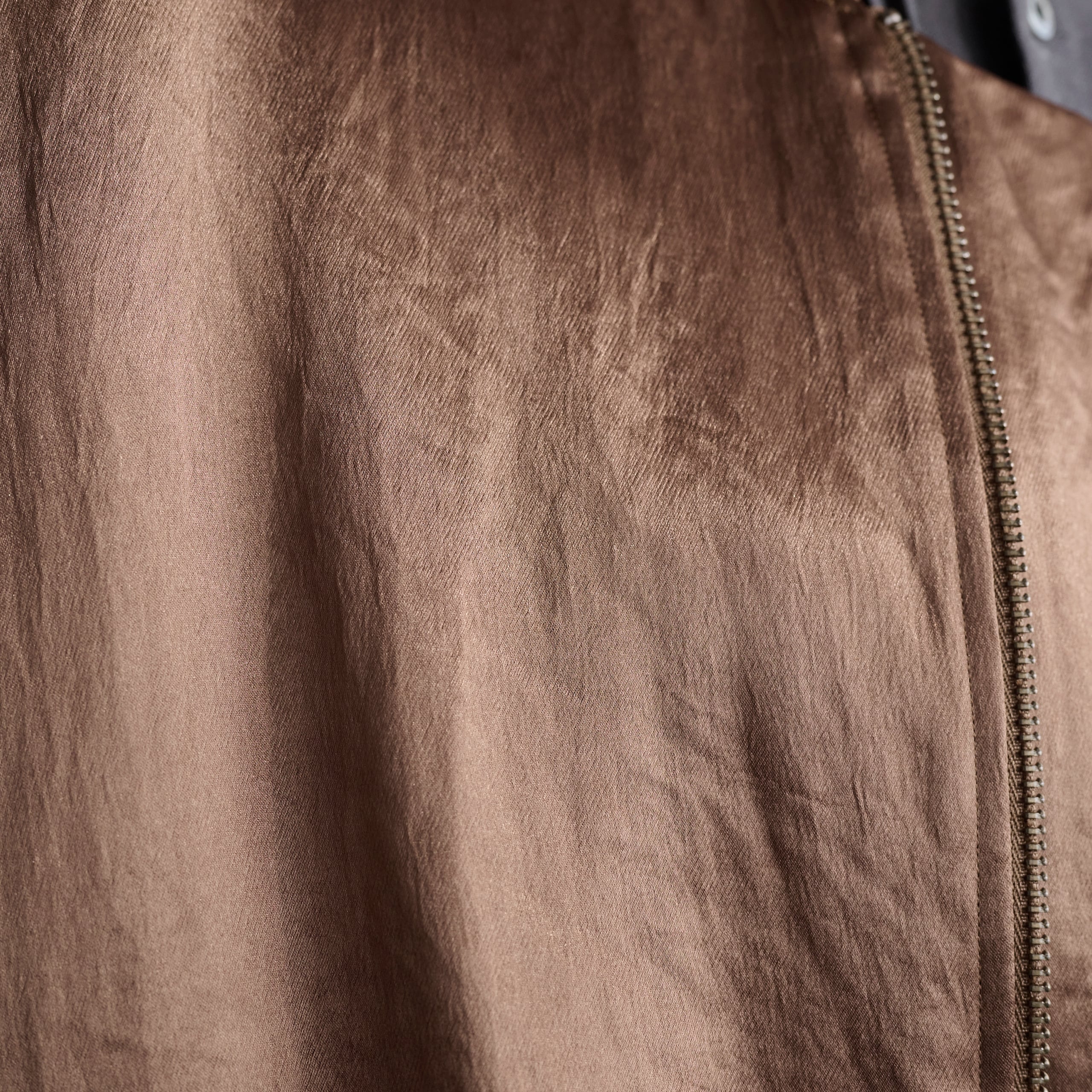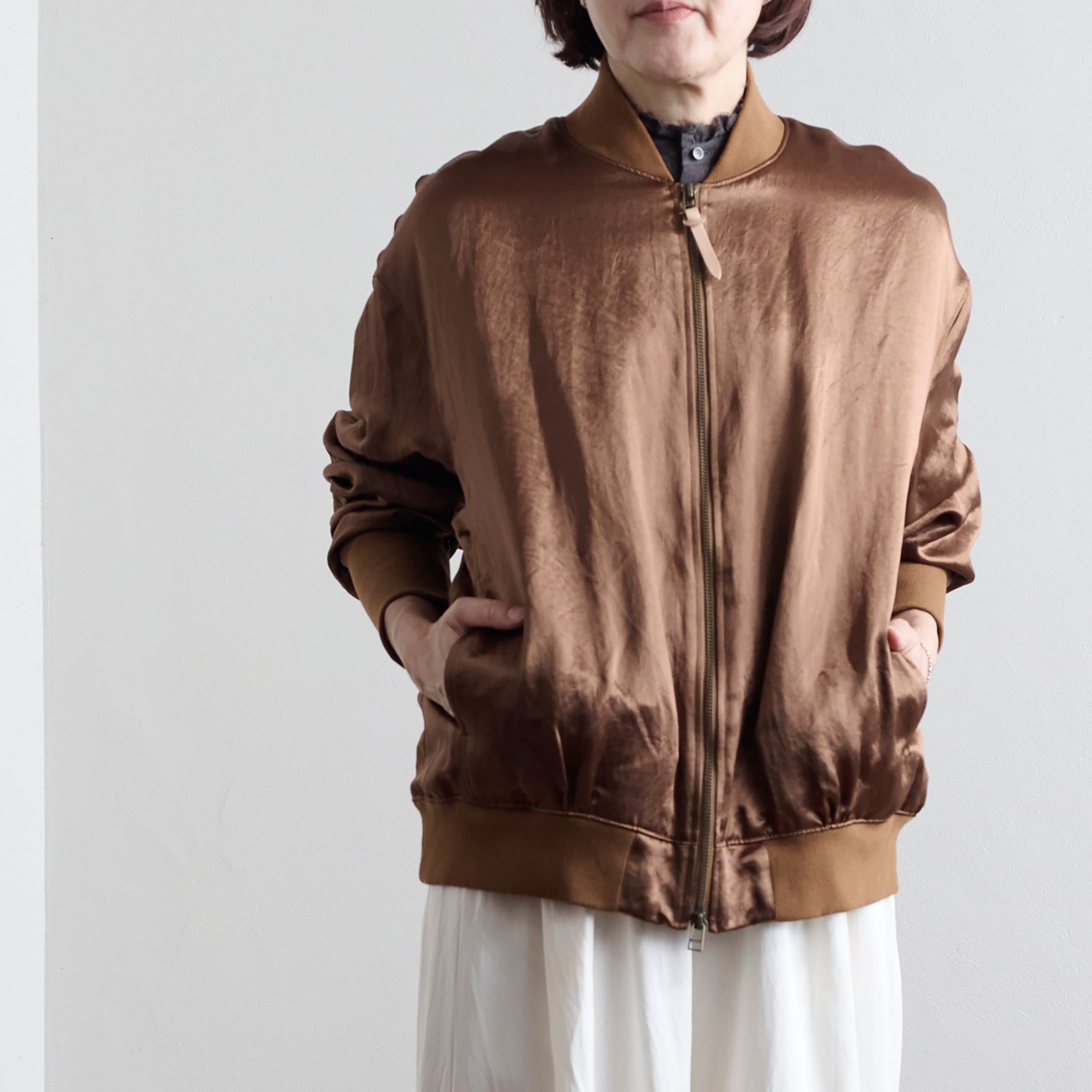 suzuki takayuki の定番的アイテムの blouson 。今シーズンは光沢のある素材を使用して、柔らかさとふっくらした素材感と光沢感がやさしい表情の中にもエレガント感を打ち出しています。