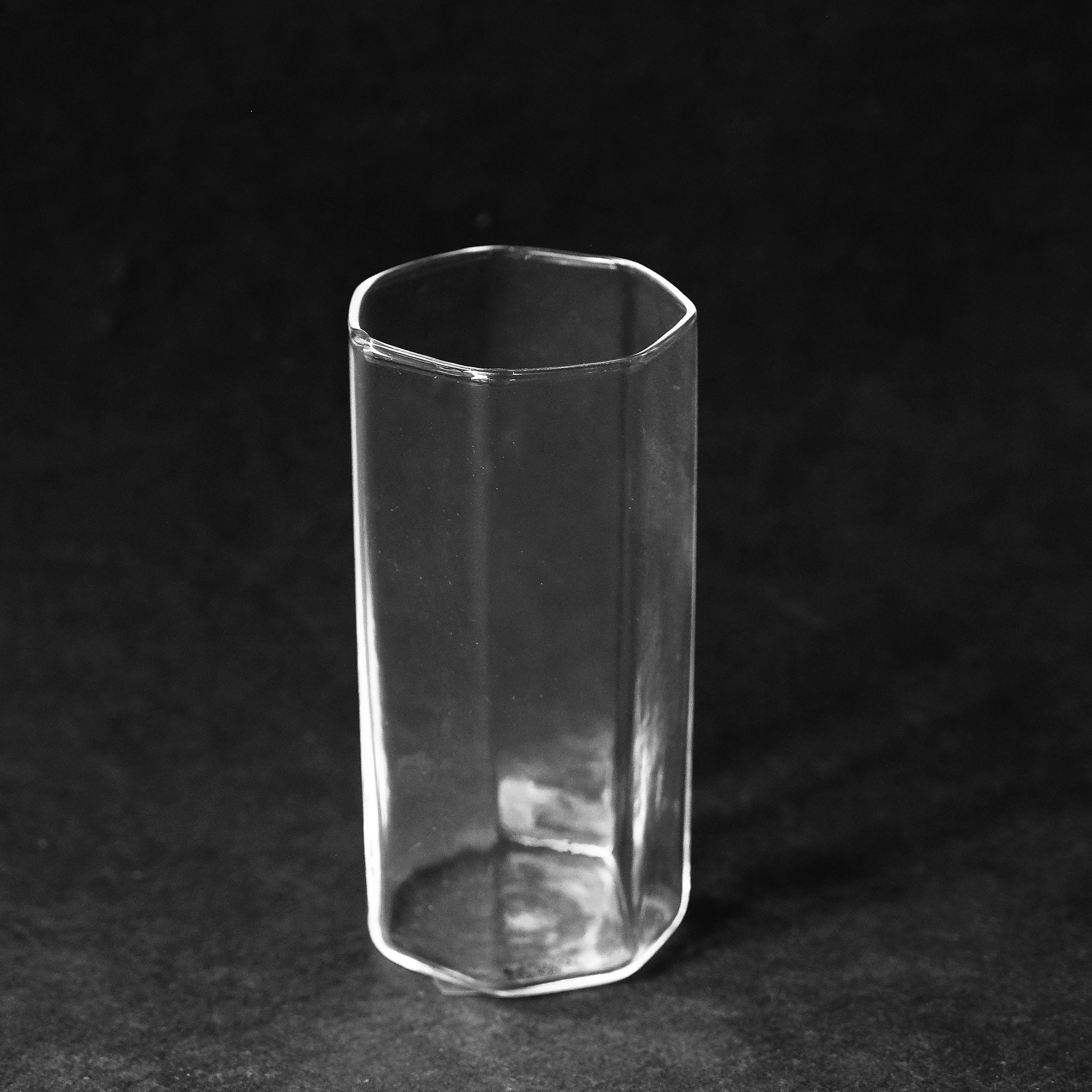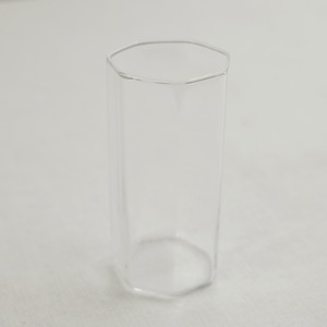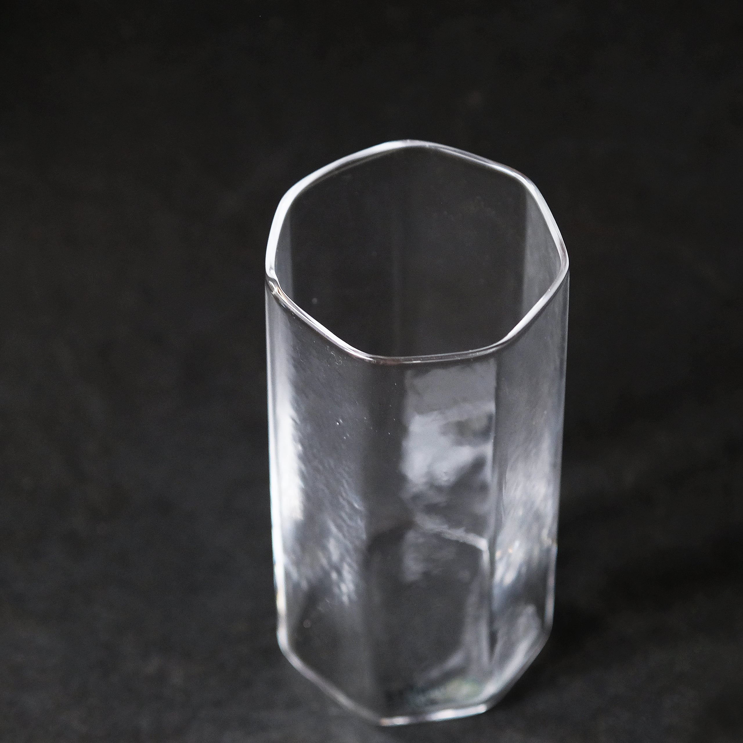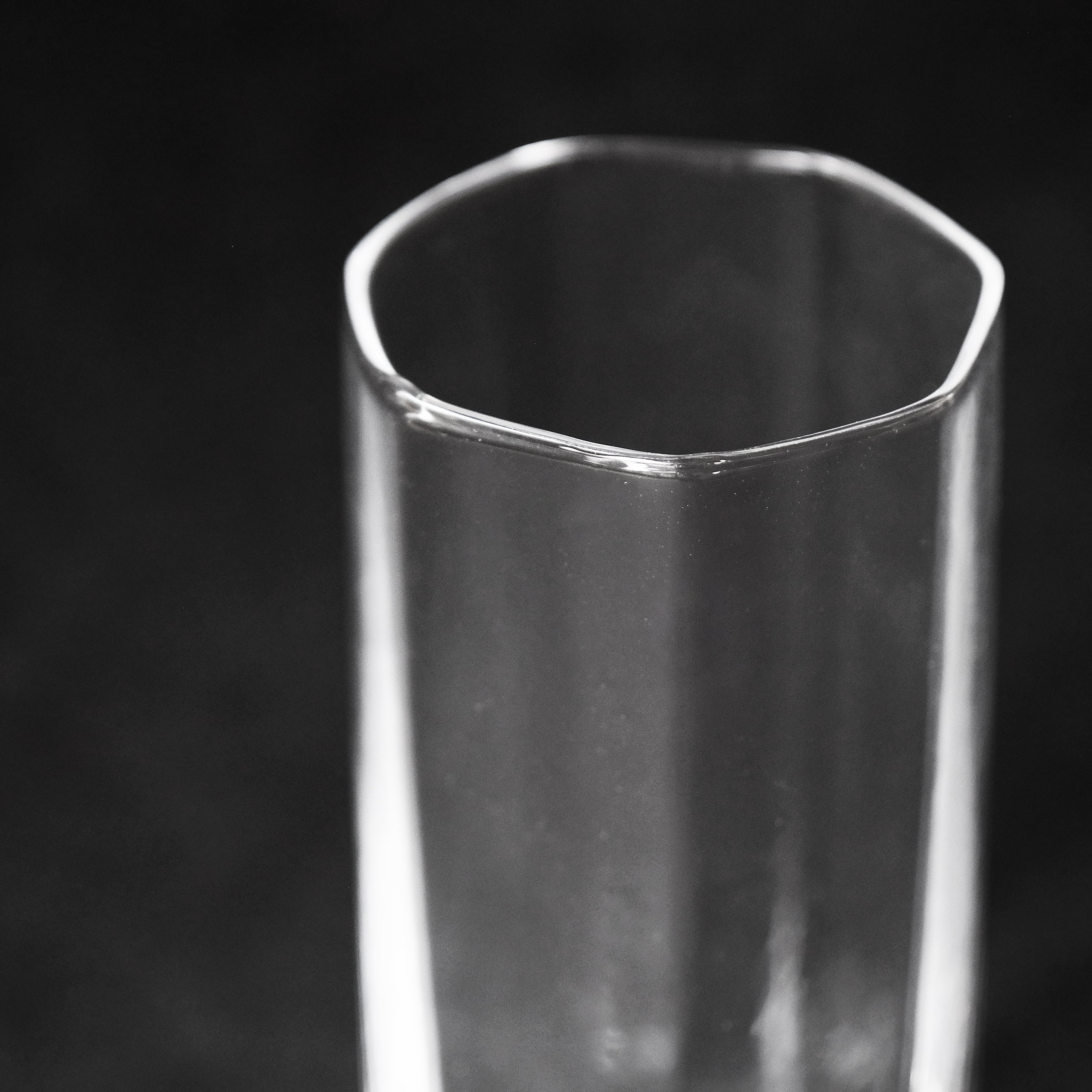 ガラスは軽くて繊細で儚いもの・・・それらを邪魔しないように素っ気ない作品を作られる谷口さんの使い勝手の良い七角形のグラス。無色透明な色の無いガラスを使用されています。それをなるべく均等な厚さに仕上げられています。
