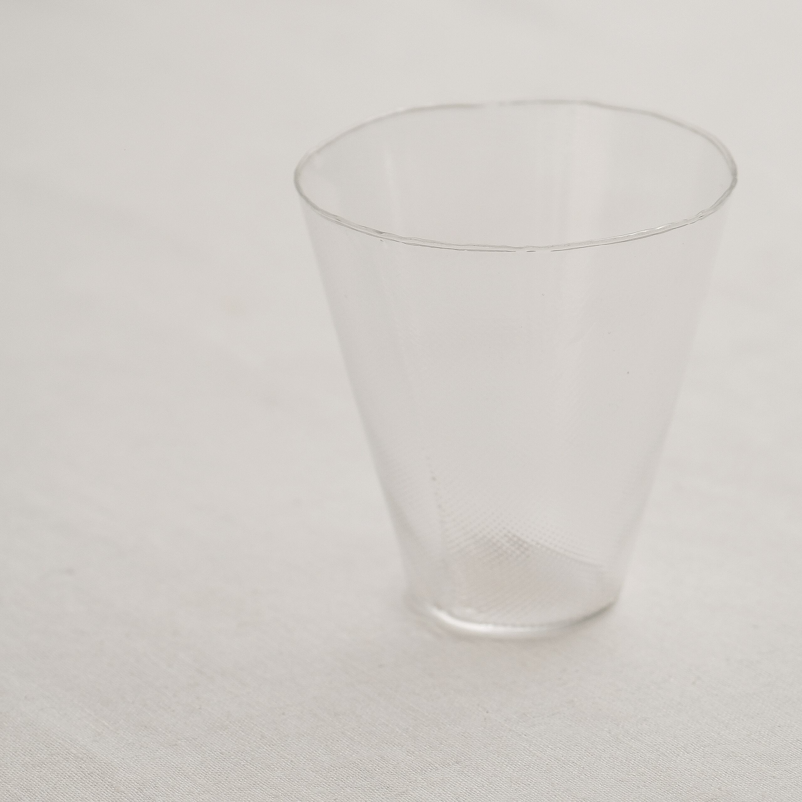 ガラスは軽くて繊細で儚いもの・・・それらを邪魔しないように素っ気ない作品を作られる谷口さんの使い勝手の良い網模様をあしらったグラス。継ぎ目の意匠も特徴的です。無色透明な色の無いガラスを使用されています。それをなるべく均等な厚さに仕上げられています。