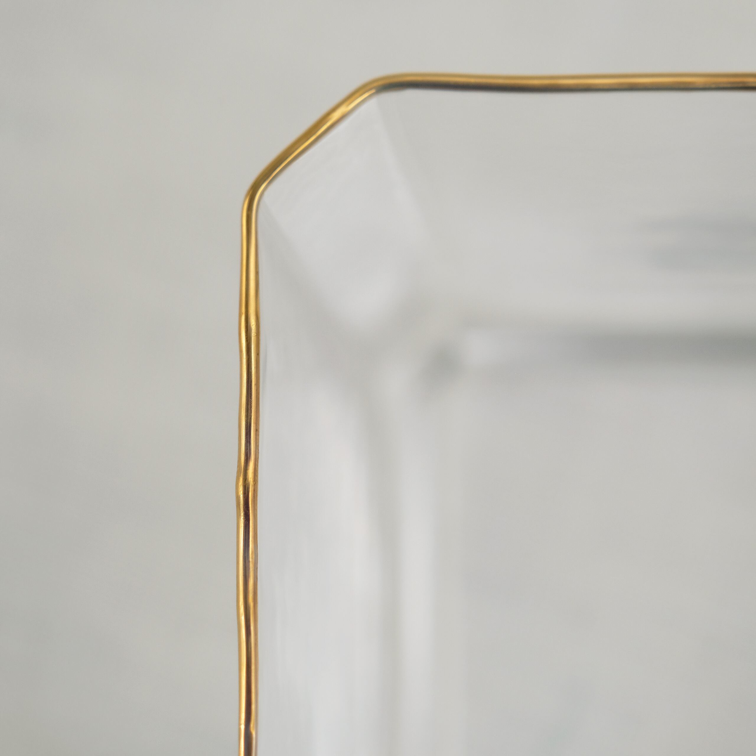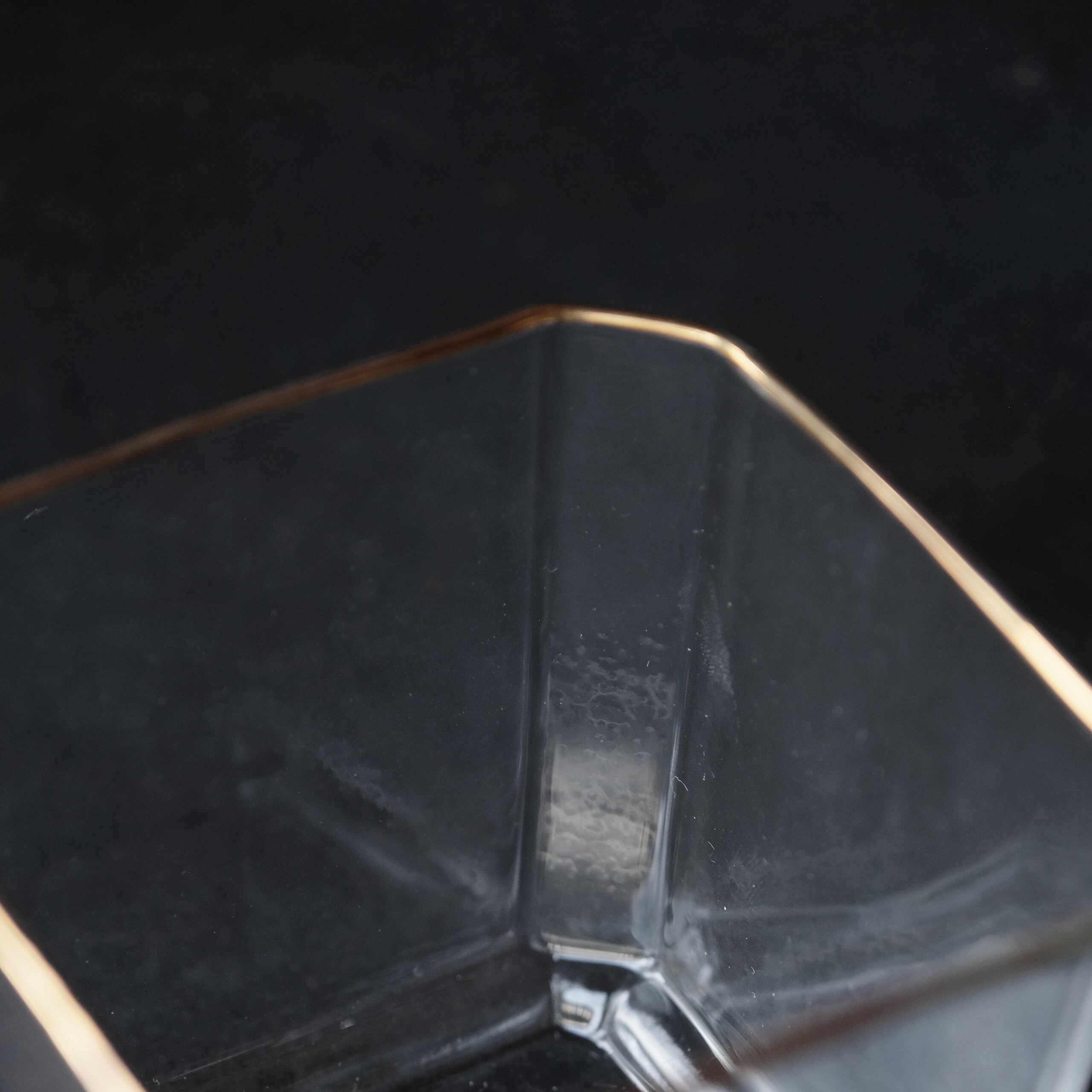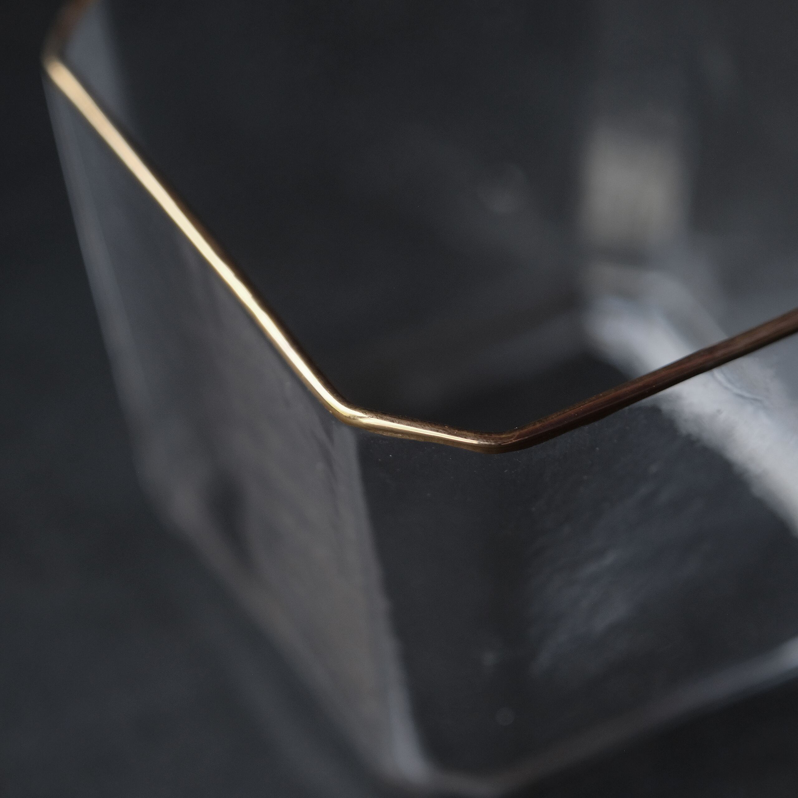 谷口さんの代表的な意匠のひとつでもある金彩縁。ガラスを切る際には小さな欠けが生じます。きれいにカットする方法もありますが、谷口さんは欠けた部分を少し残してガラスらしくしています。その端をきれいに仕上げる為に縁に金彩をほどこしてあります。