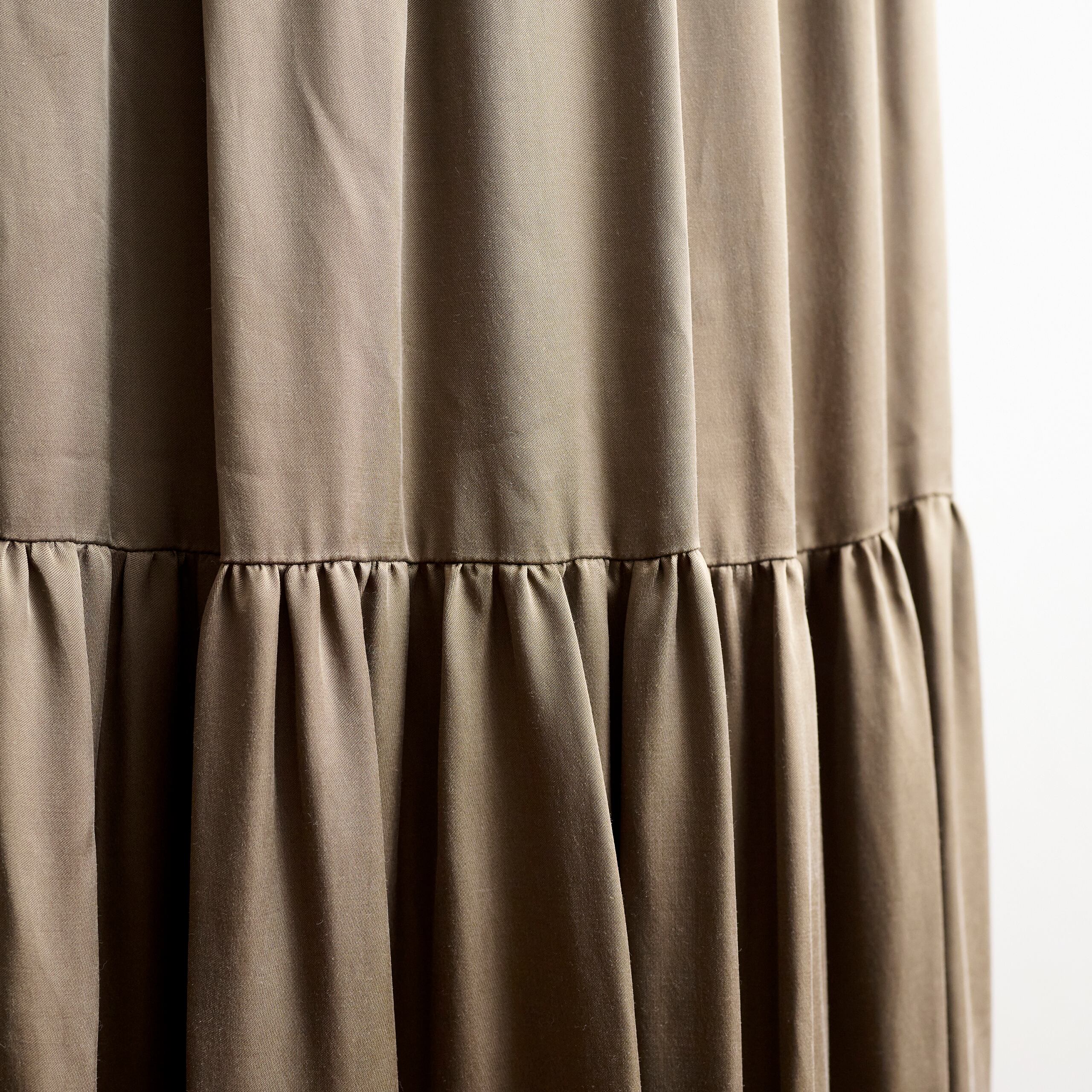 上品な光沢感のある滑らかな手触りのサテン生地を使用したティアードスカートです。下に重心のある二段の切り替えで、華やかでありながらもフェミニンすぎないシックな雰囲気に仕上げております。後ろがゴムの仕様となっておりリラックスした着用感でお召しいただけます。左脇のコンシールファスナーで着脱していただく仕様となっております。