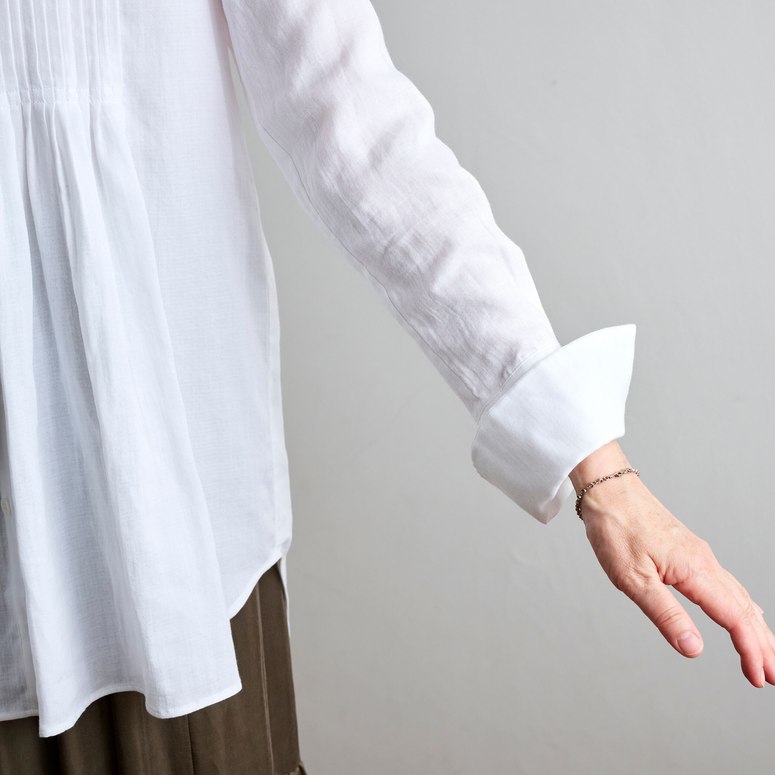 ピンタックによるドレープと、後ろ身頃にギャザーを入れることで裾にかけて広がる立体的で柔らかなシルエットを作り出しております。リボンの有無や結び方によって雰囲気を変化させてお召しいただけます。