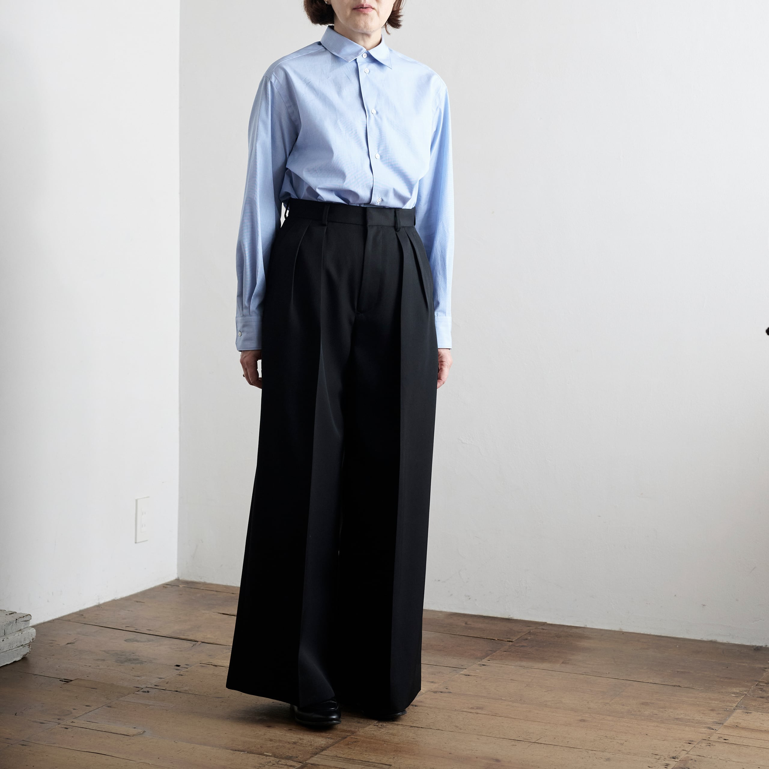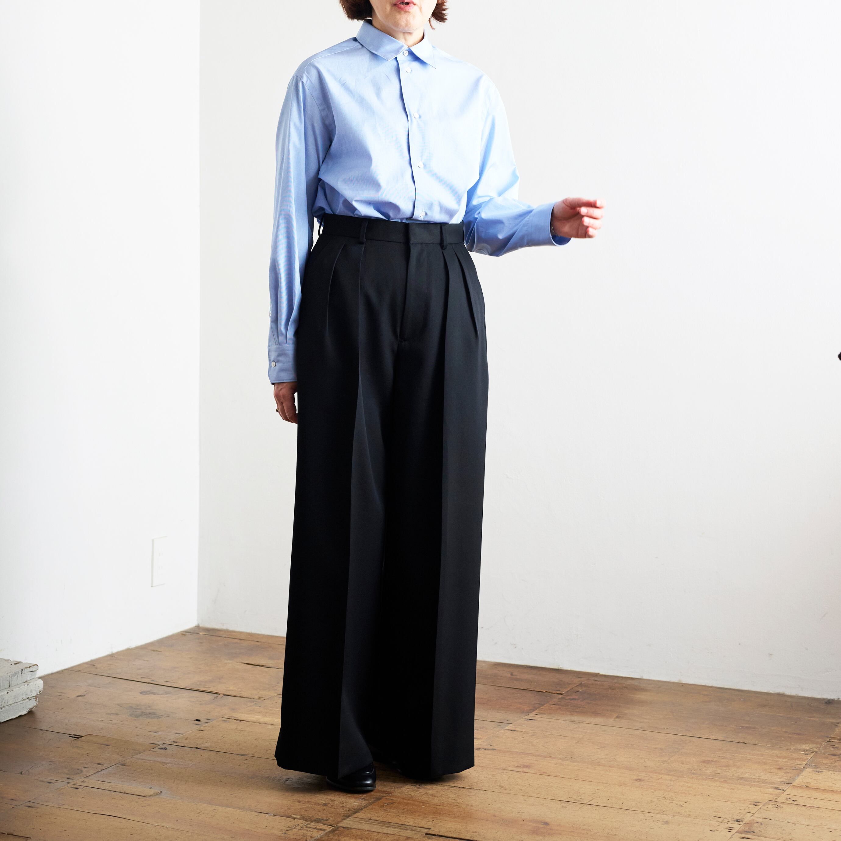 マニッシュなバギーパンツはヒップから裾にかけてズドンと真っすぐに落ちるきれいなシルエットのバギーパンツは、たっぷりとした分量感が魅力です。シンプルなトップス合わせも都会的で洗練された印象に。