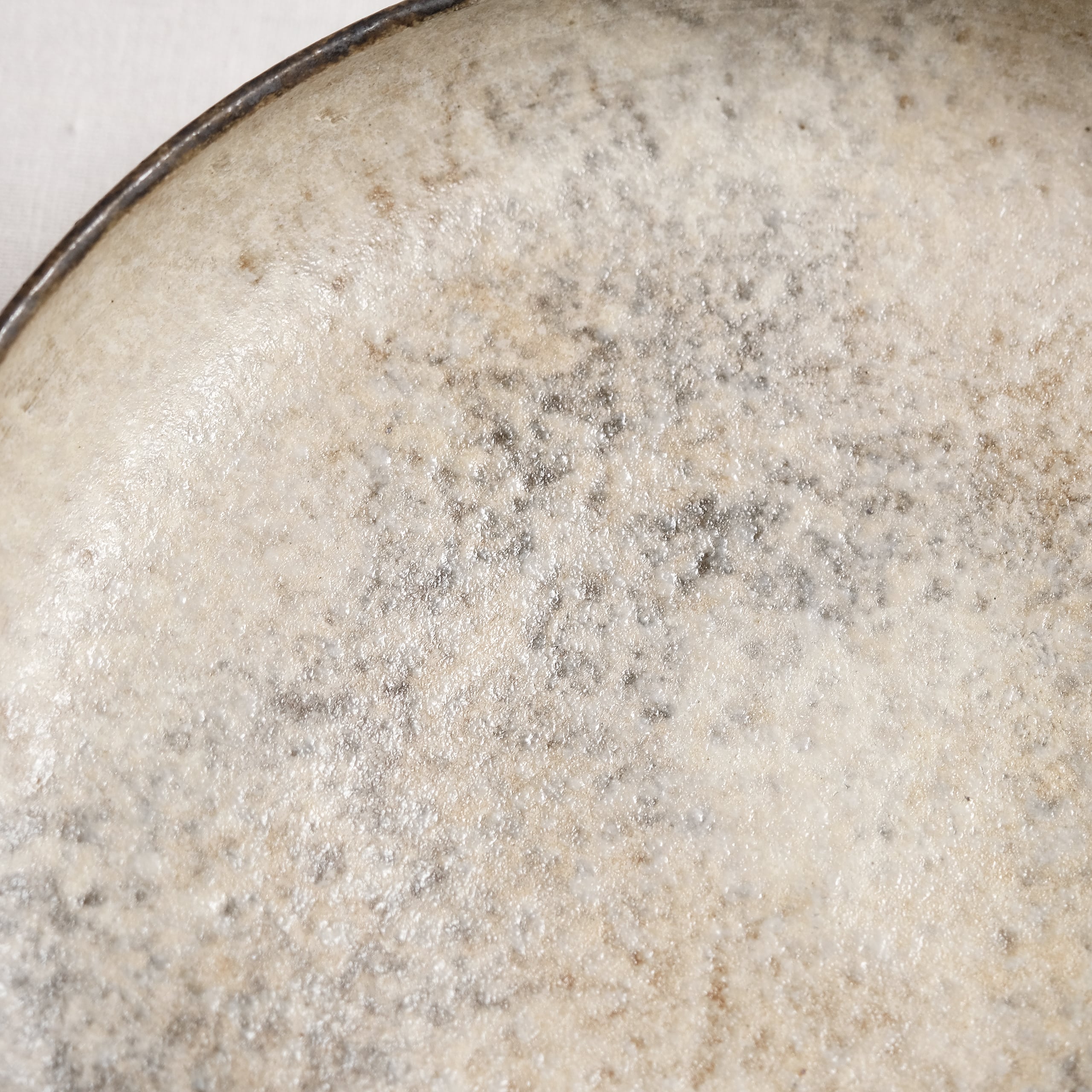 石のように見える表情の高木さんの器。黒や茶色の化粧土で色付けしています。そして磁器の粉を混ぜた釉薬を霧吹きで吹き付けて高めの温度で焼いています。その結果石のようにも見える独特な表情に仕上がっています。こちらは外側に黒の釉薬をかけてあります。