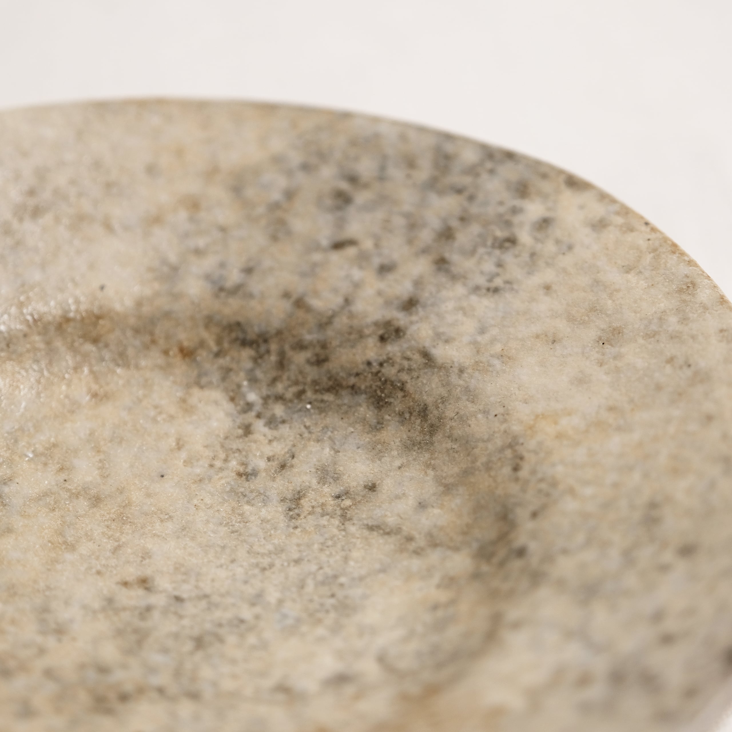 石のように見える表情の高木さんの器。黒や茶色の化粧土で色付けしています。そして磁器の粉を混ぜた釉薬を霧吹きで吹き付けて高めの温度で焼いています。その結果石のようにも見える独特な表情に仕上がっています。