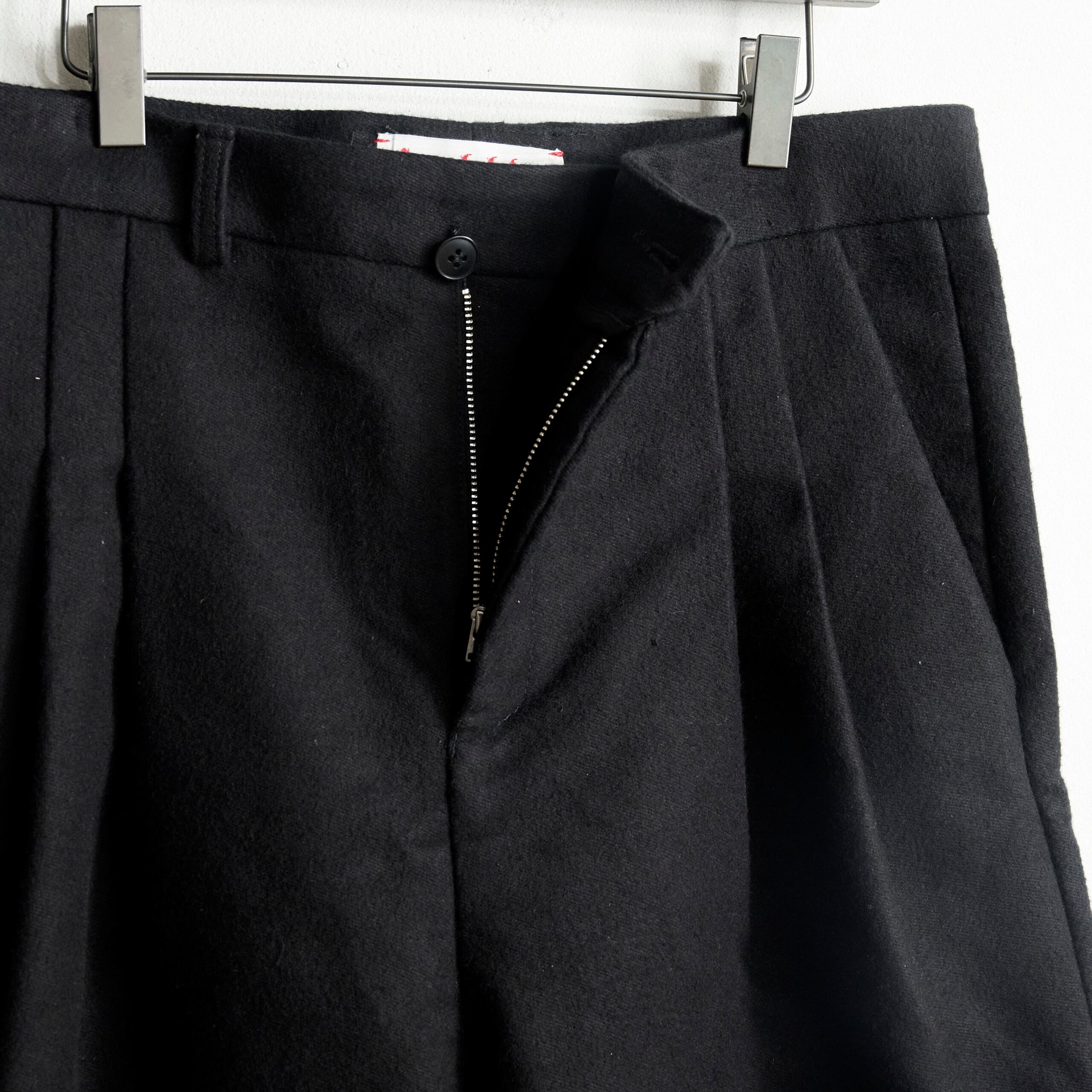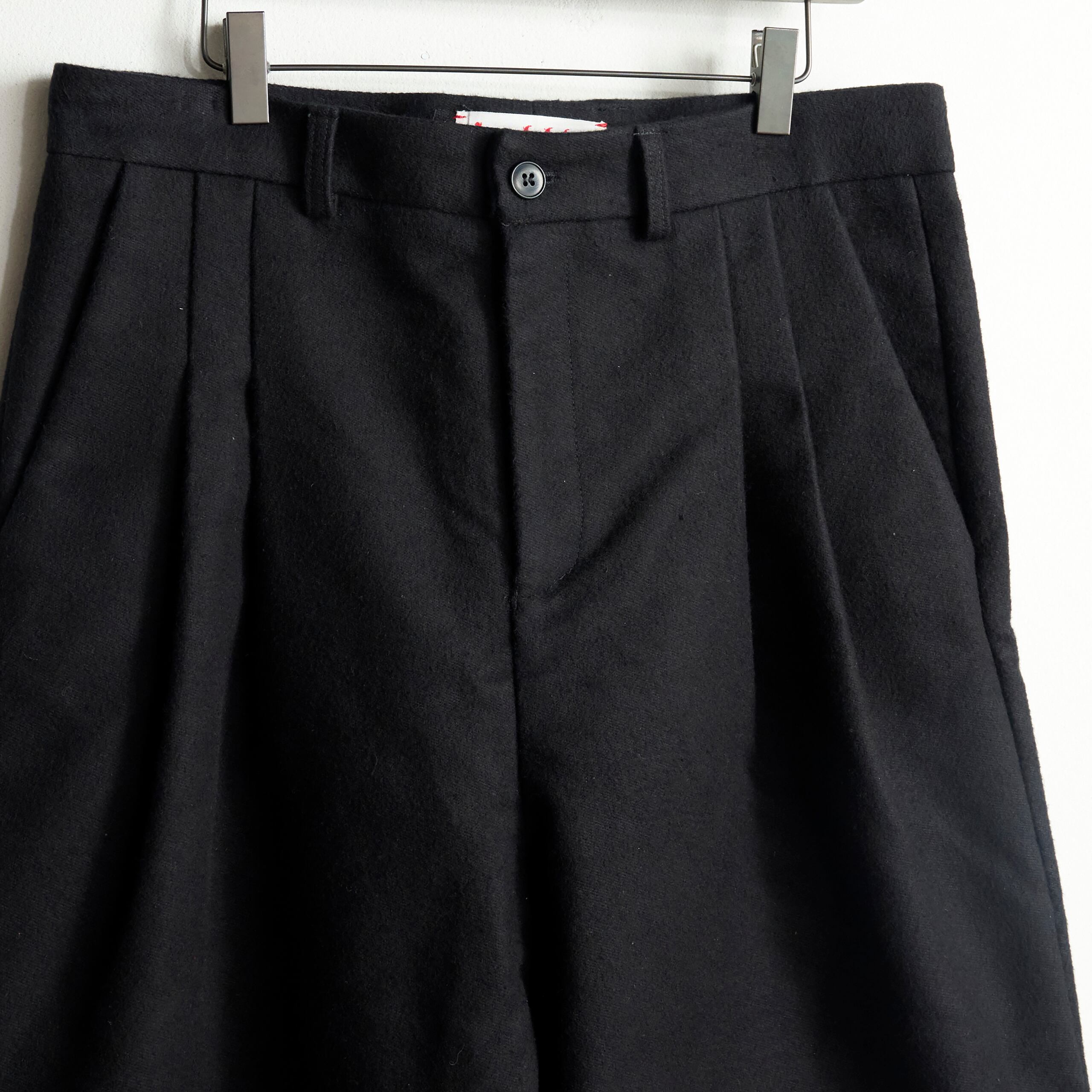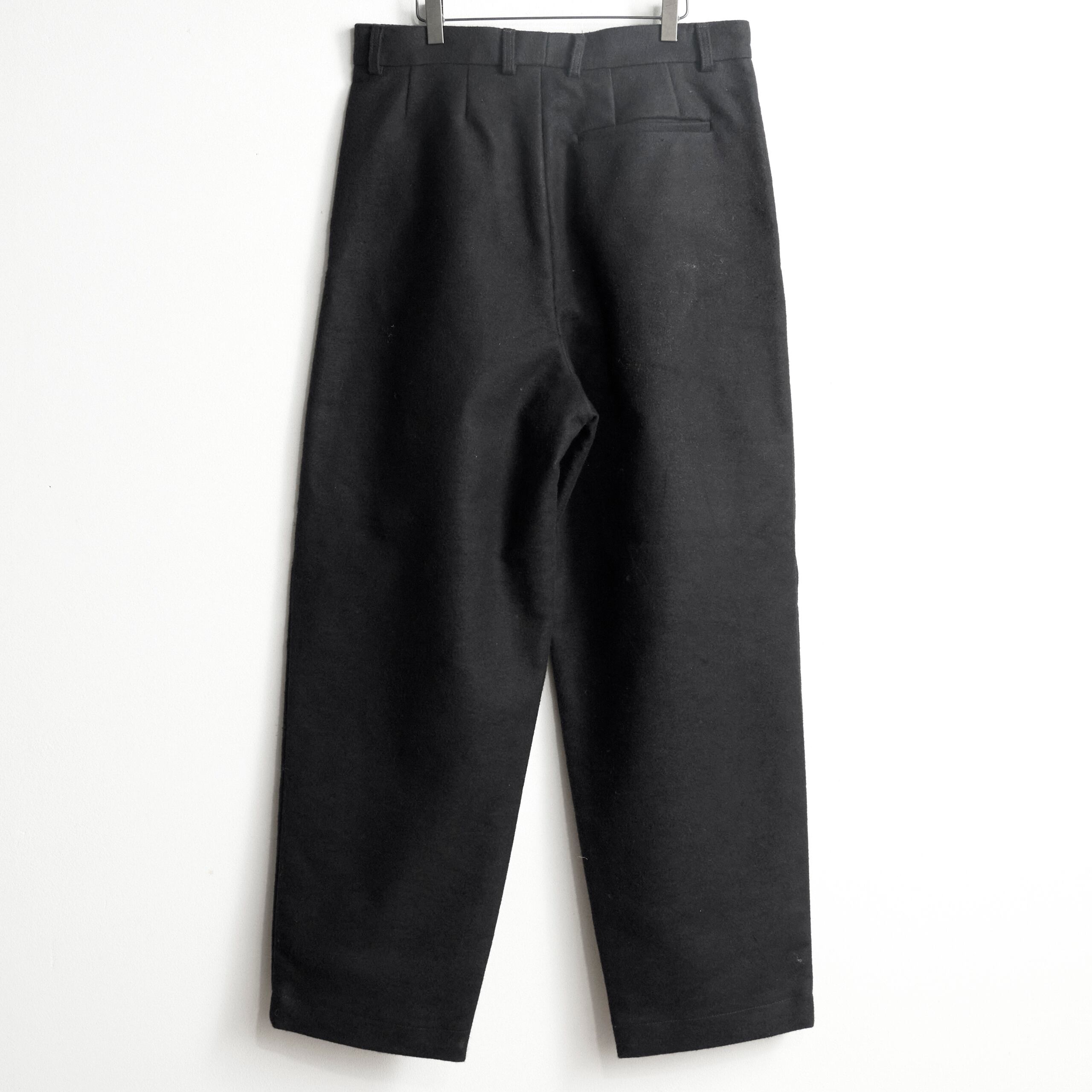 テーパードの効いた2タックパンツとなります。張りのある分厚い生地から寄与された立体感が構築的なシルエットが秀逸。