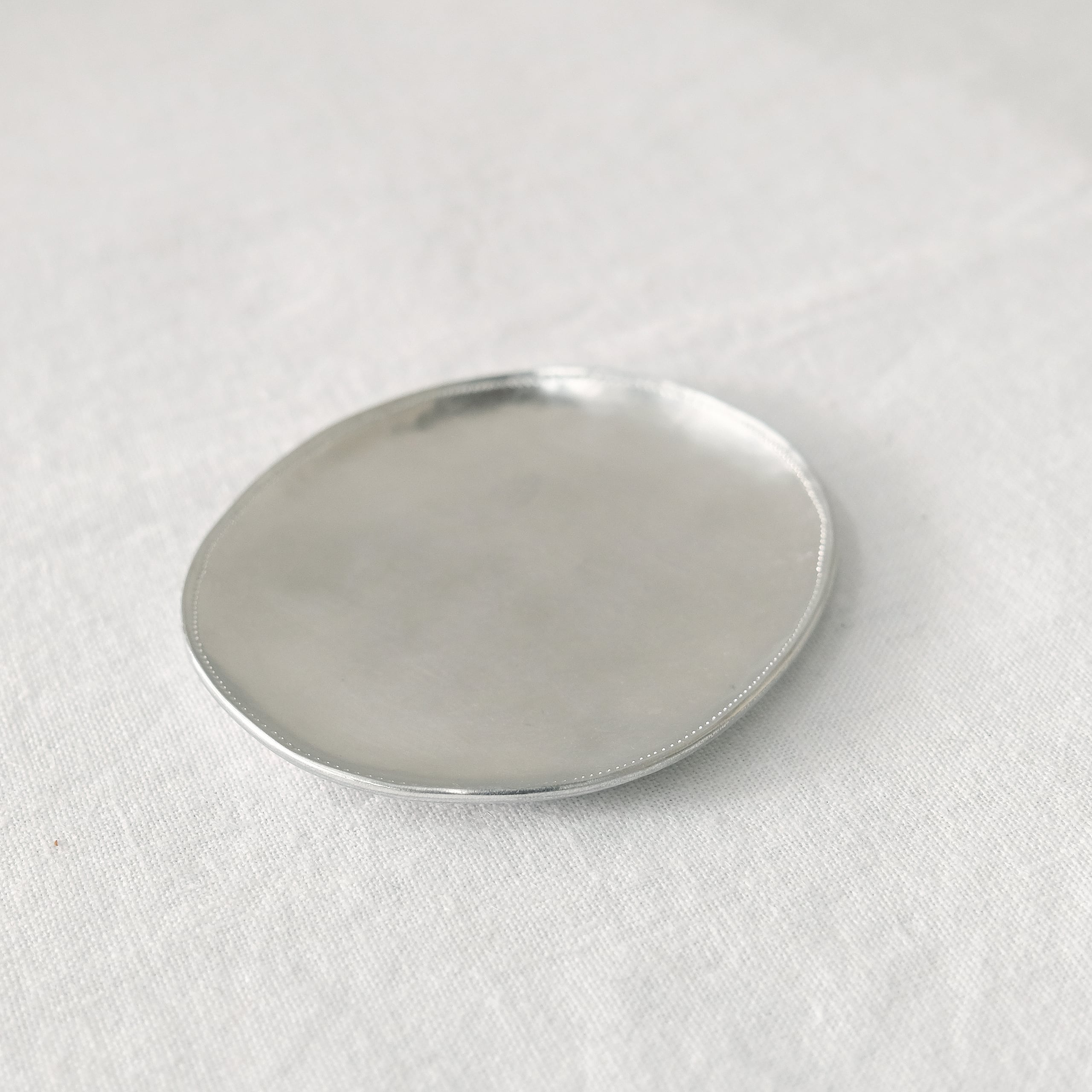 アルミの鈍い光が印象的なお皿です。端にタガネで打ち込まれたドット柄の意匠が与えられています。ウエイトもあって厚みもしっかりとした素材です。