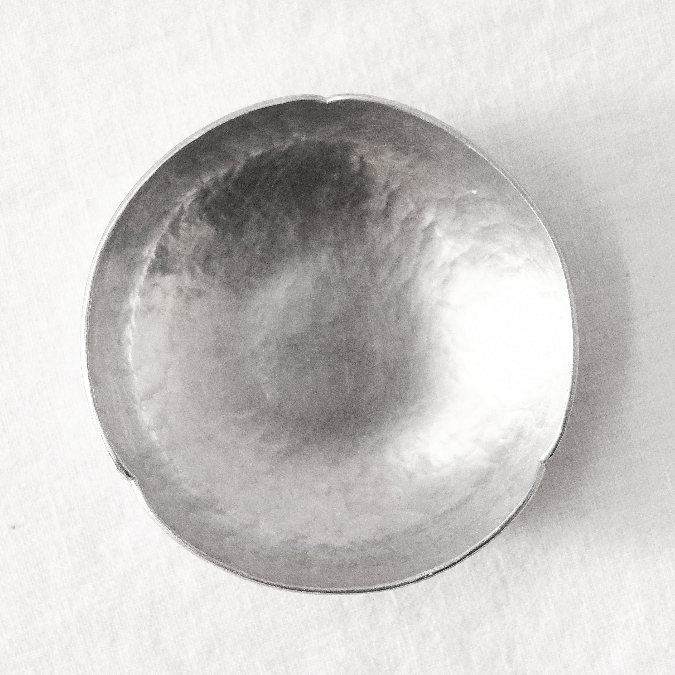 アルミの鈍い光が印象的なお皿です。端に花弁の意匠が与えられていて、打ち痕もと特徴になっています。ウエイトもあって厚みもしっかりとした素材です。