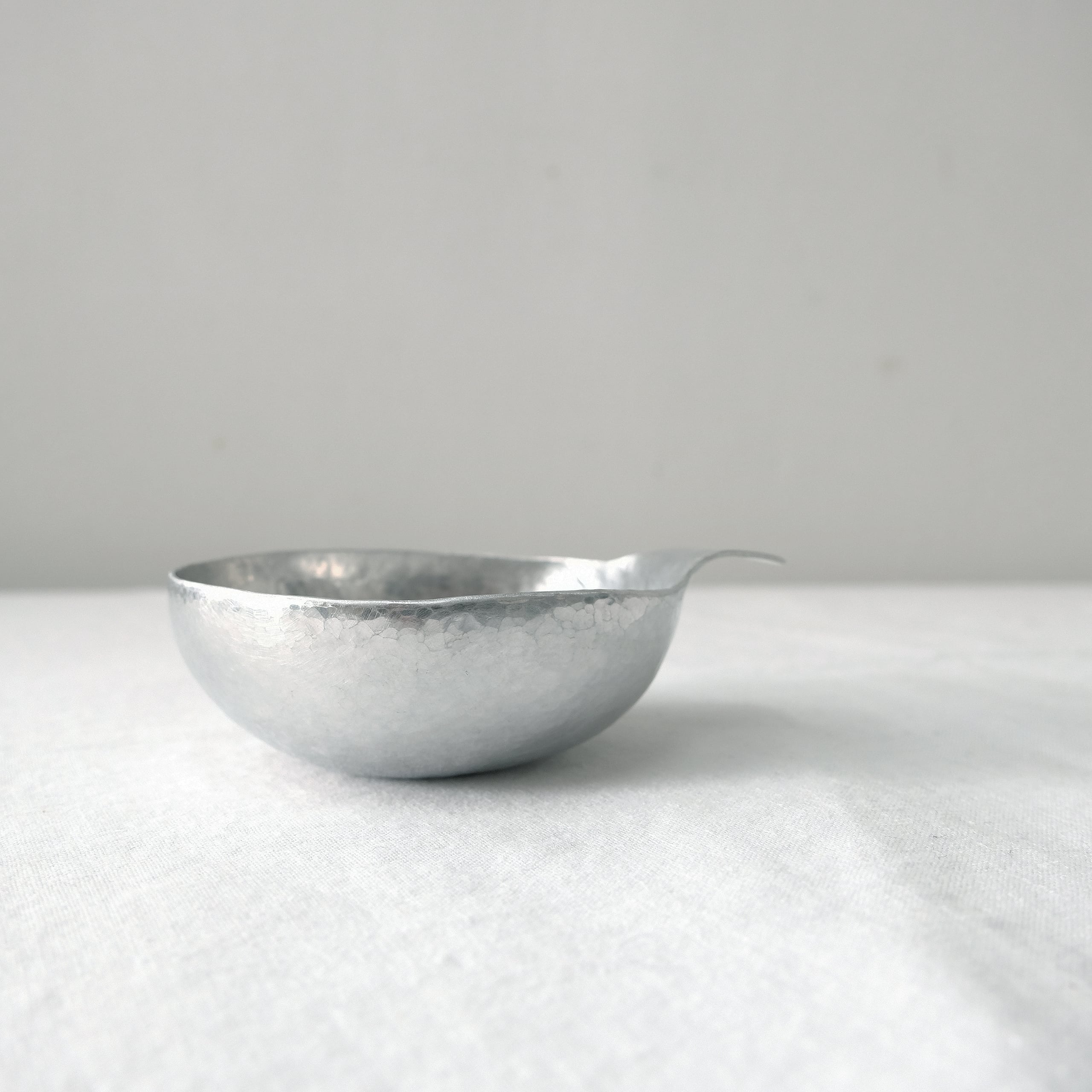 アルミの鈍い光が印象的なお皿です。取っ手のついた意匠と打ち痕が特徴になっています。ウエイトもあって厚みもしっかりとした素材です。とんすいのような使い方もできますね。
