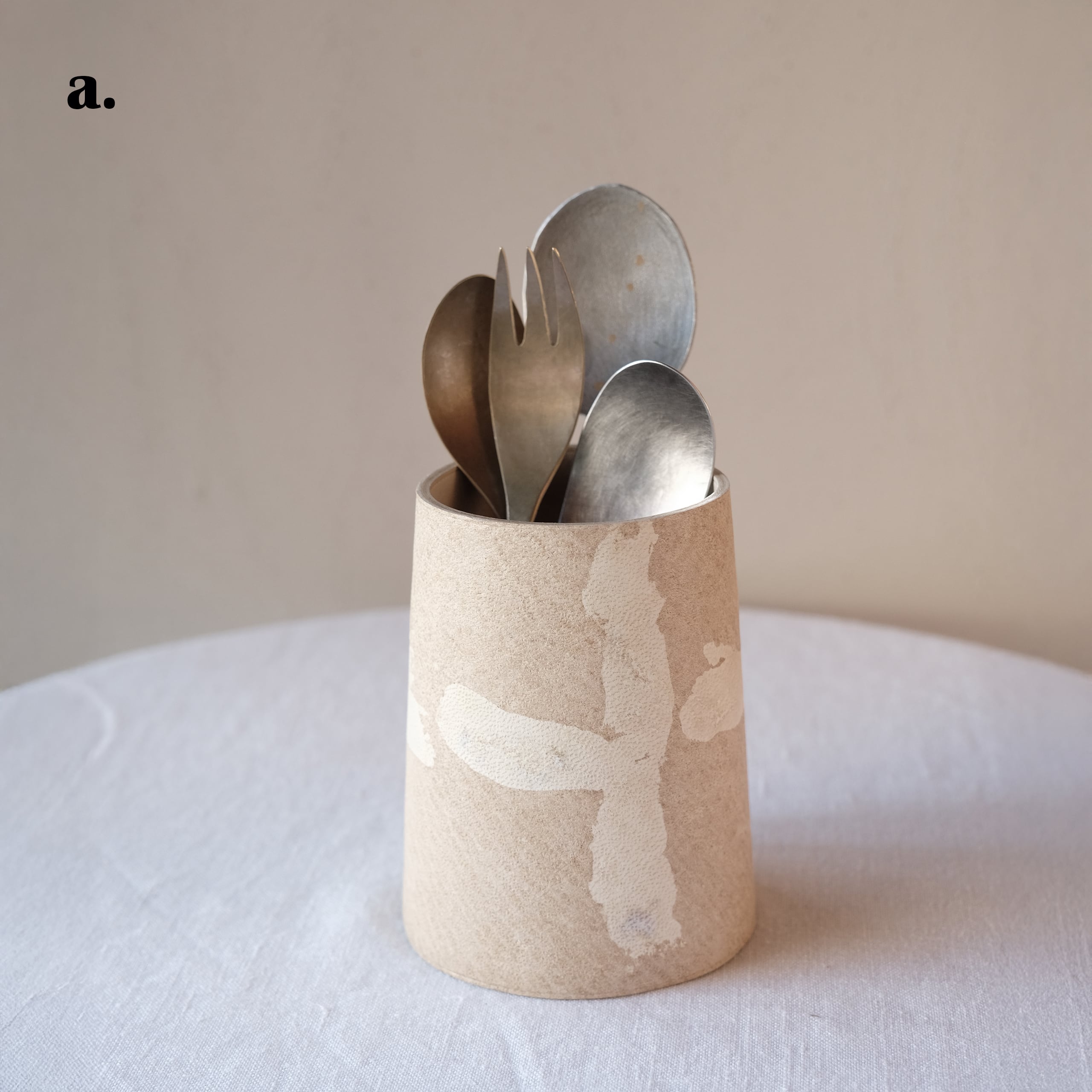 革で作られた本来はペンスタンドとして作られましたが、今回の企画に合わせてカトラリースタンドとしてご紹介させていただきます。手描きの柄をあしらってあります。