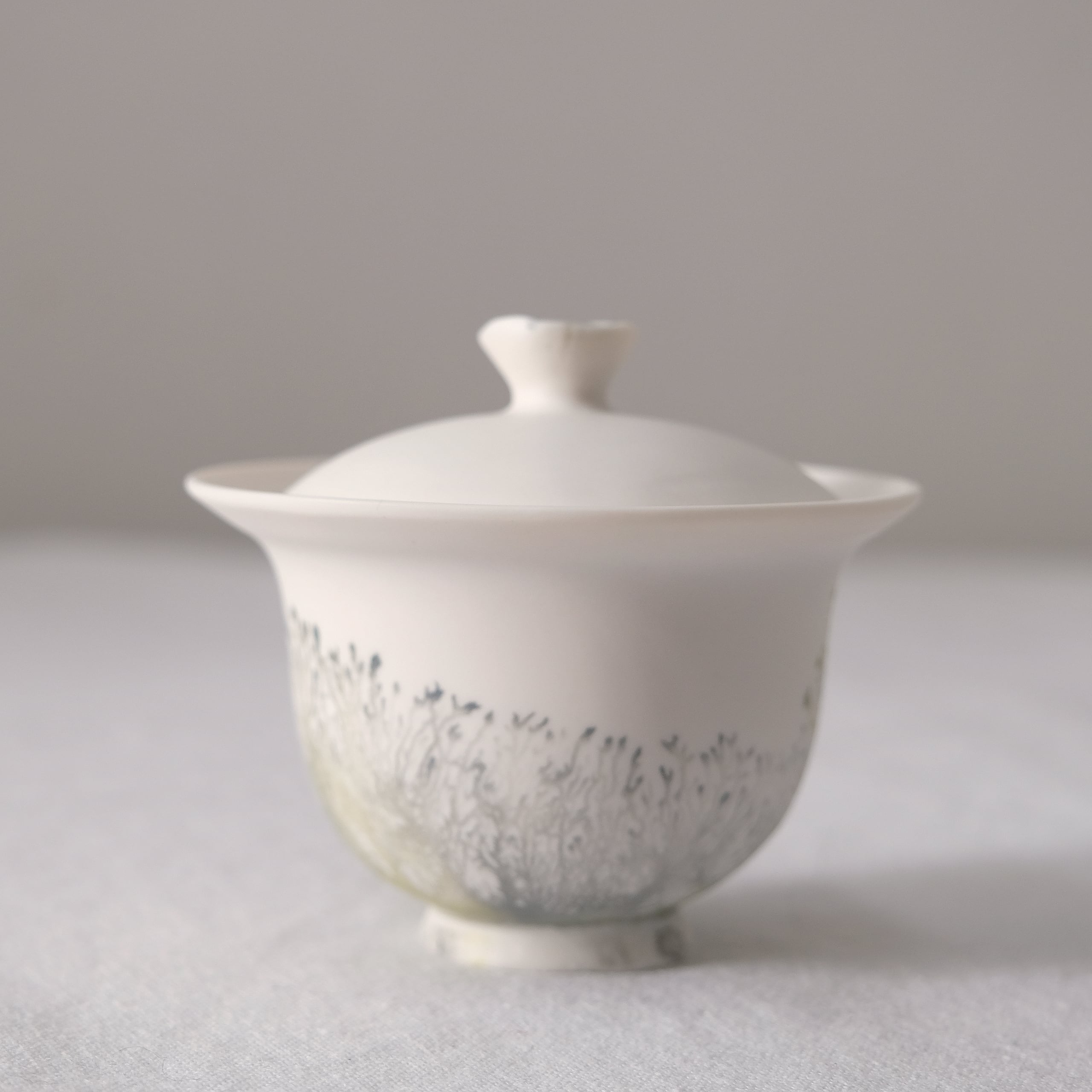 モカウェアと呼ばれる技法で描かれた模様が印象的な蓋椀。磁器の滑らかな白色に絵具をかけたようなアートを感じさせる器です。受け皿は高台の受け部分が無いので、蓋椀と合わせてお菓子を載せてもお使いいただけます。
