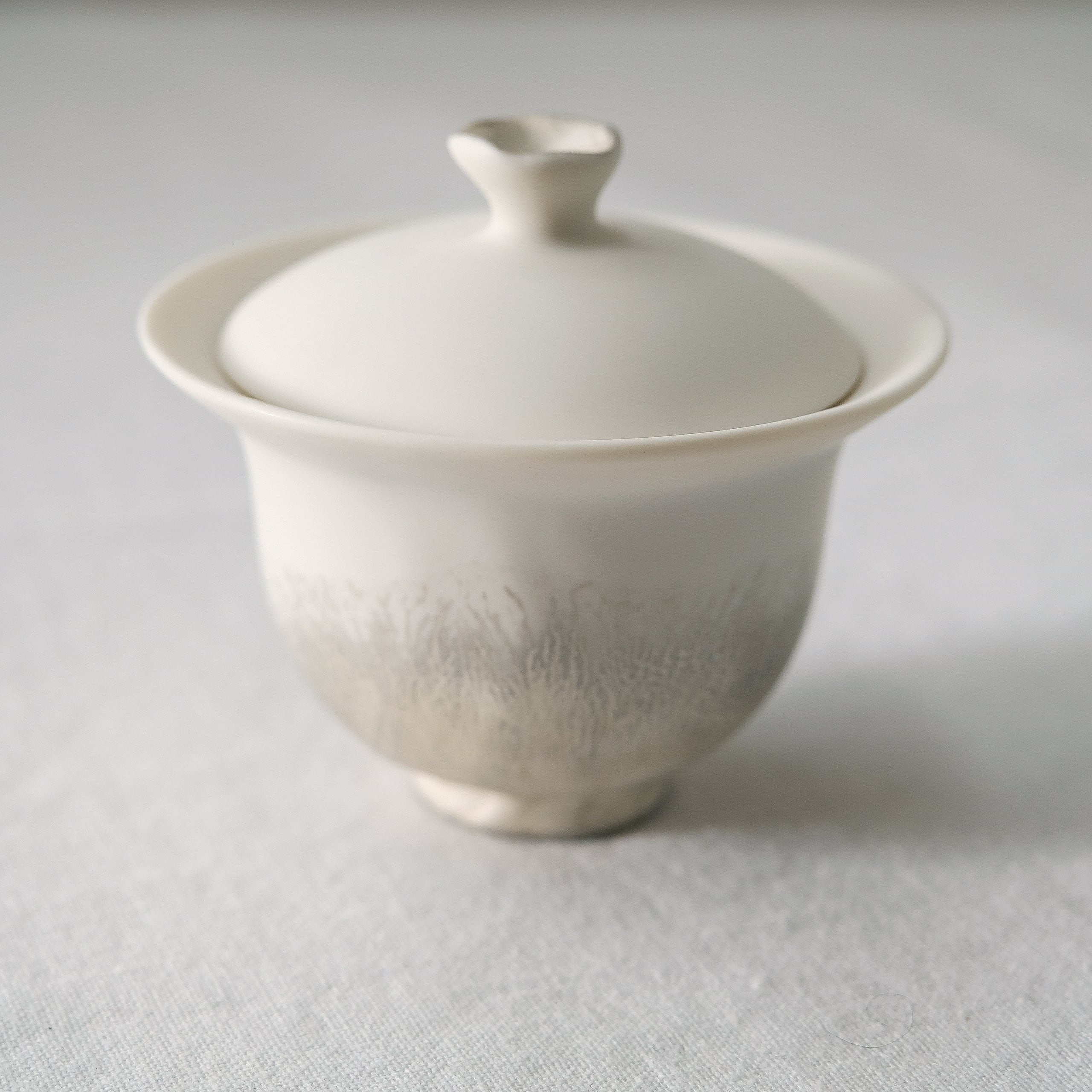 モカウェアと呼ばれる技法を用いて銀彩で描かれた模様が印象的な蓋椀。磁器の滑らかな白色に絵具をかけたようなアートを感じさせる器です。受け皿は高台の受け部分が無いので、蓋椀と合わせてお菓子を載せてもお使いいただけます。