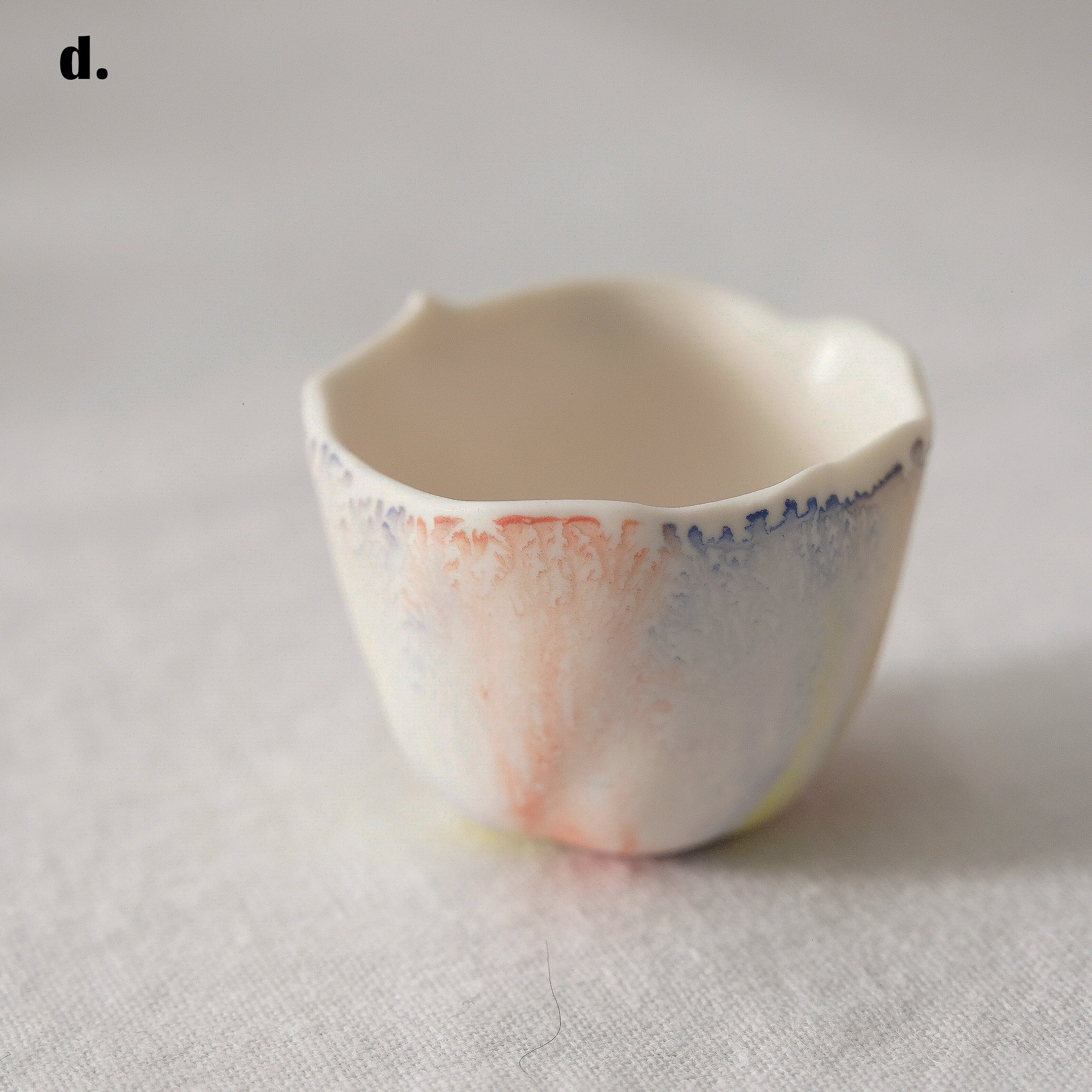 石膏型に磁土の泥を流し入れ、肉厚がついた頃に排泥して、間髪入れず、絵具を筆で落とし、泥に模様を這わせていきます。泥が乾くと絵具が広がらないため、それまでの約1分間、精神を集中させて、模様を施されているとのこと。とても刹那的な言わば全てが一点物と言ってもよい器です。