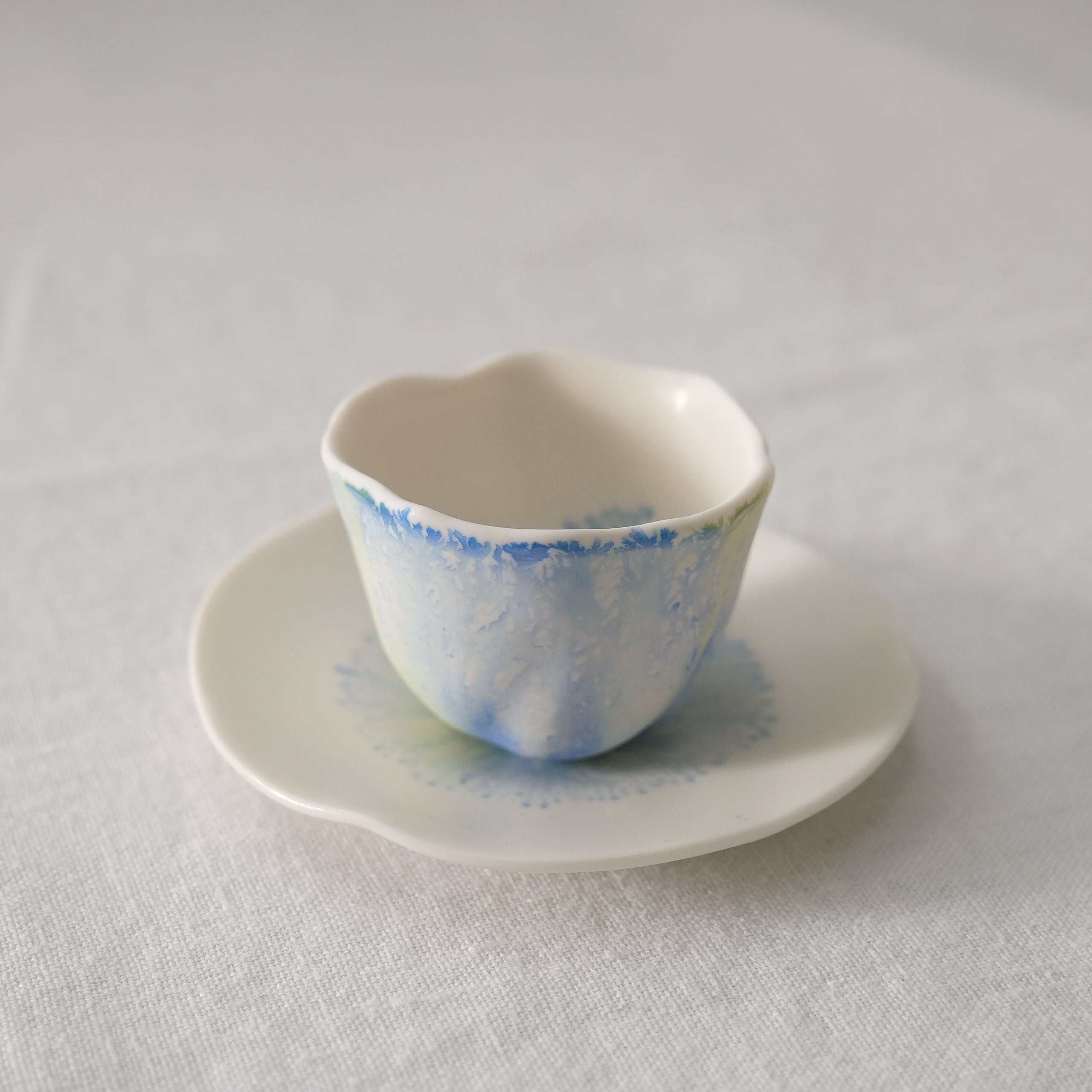 石膏型に磁土の泥を流し入れ、肉厚がついた頃に排泥して、間髪入れず、絵具を筆で落とし、泥に模様を這わせていきます。泥が乾くと絵具が広がらないため、それまでの約1分間、精神を集中させて、模様を施されているとのこと。とても刹那的な言わば全てが一点物と言ってもよい器です。