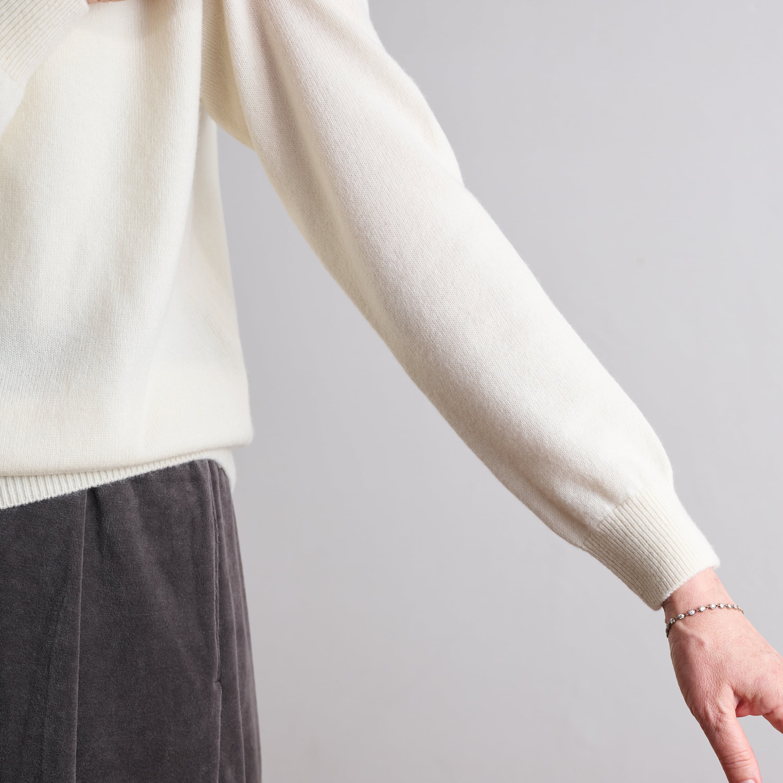 イタリアの紡績メーカーに別注した、エクストラファインメリノウール×カシミヤのスローンオリジナル ブレンド糸を用い、10ゲージ天竺をフルファッション(見頃や袖などをパーツごとに編み、リンキングと呼ばれるかがり合わせをして製品が完成すること)で丁寧に編み立てたクルーネック。