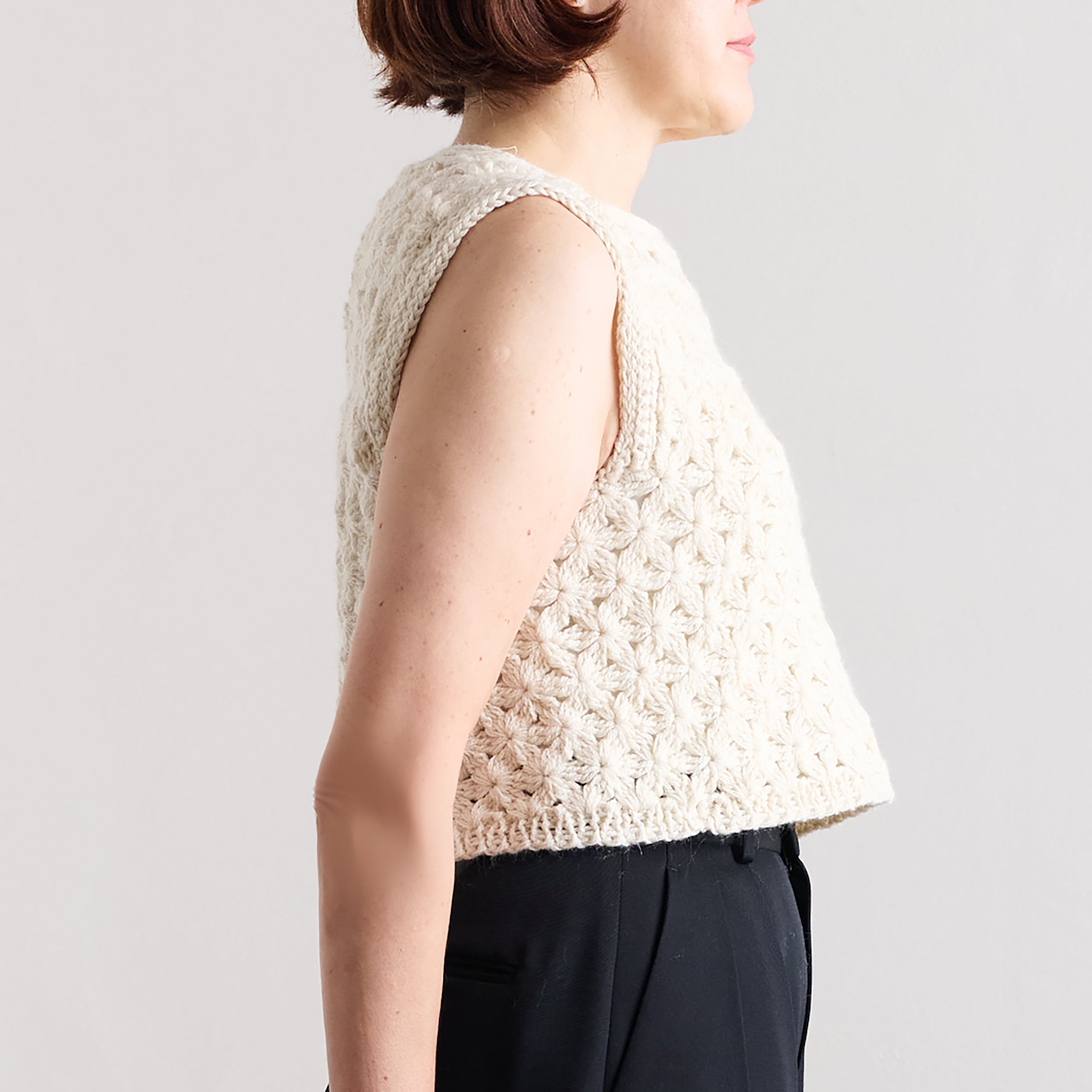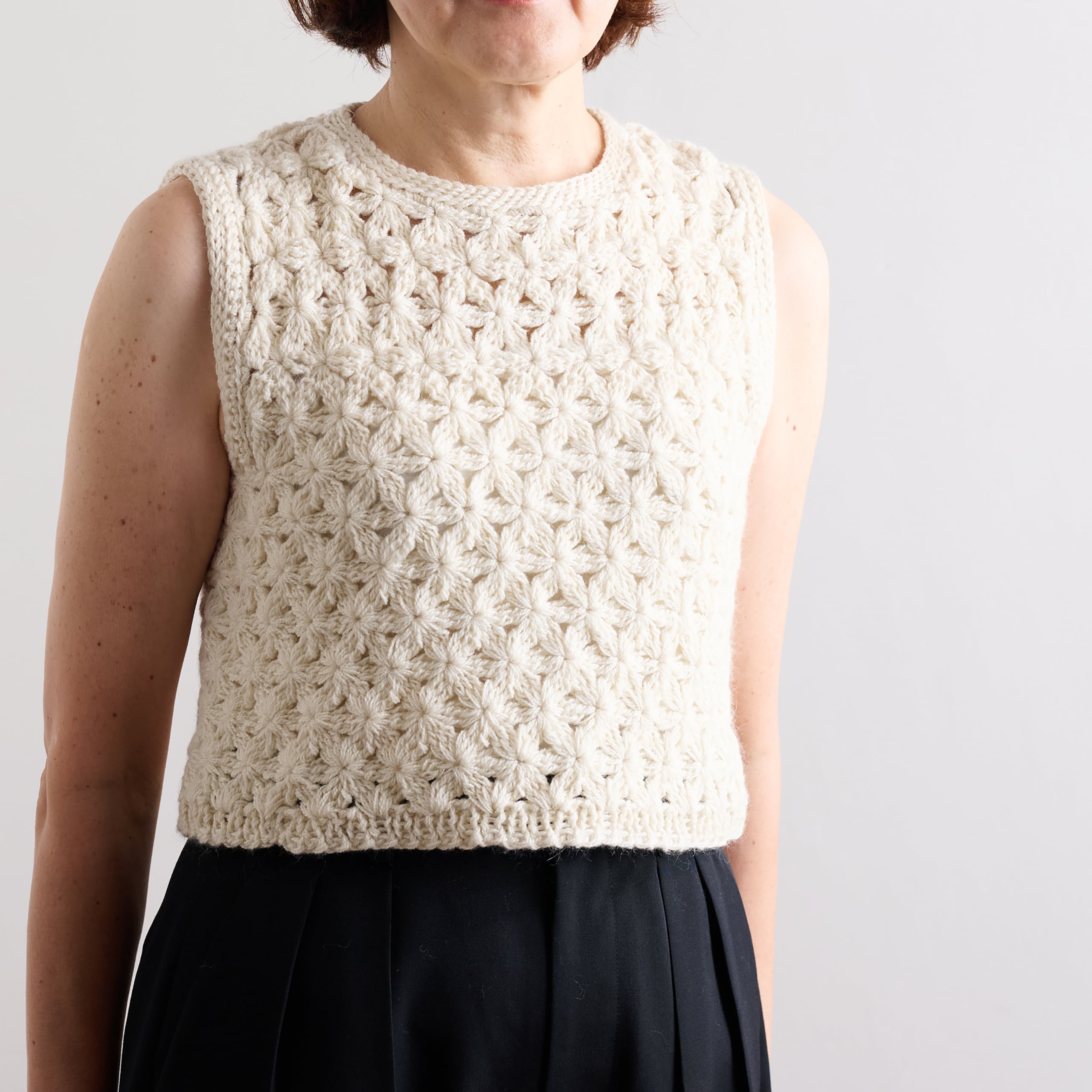 フラワーモチーフのハンドクロシェットベストです。モチーフは可愛らしいのですが、とてもクールな印象に出来上がっています。ベストと言っても一枚で着用できるスッキリしたサイジングです