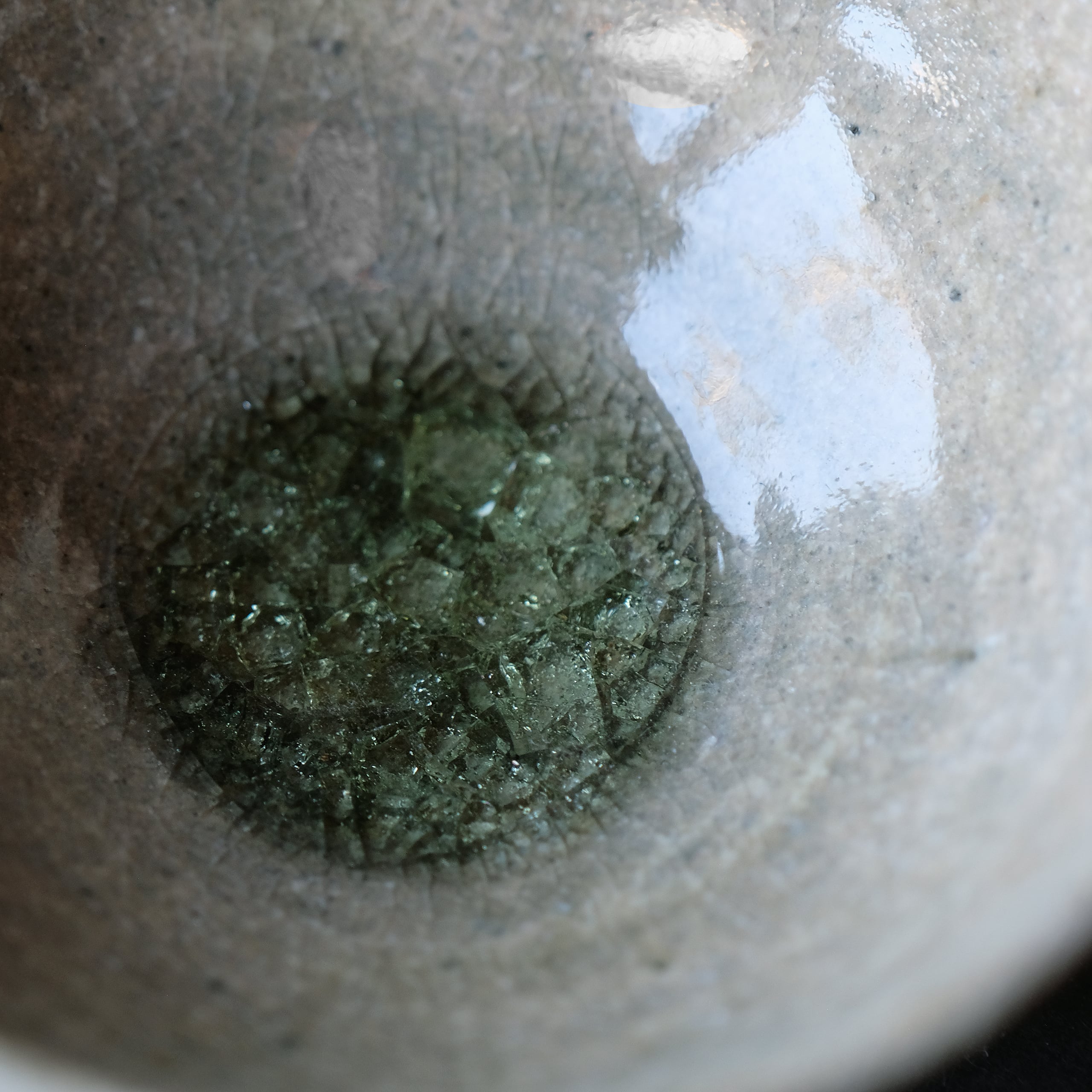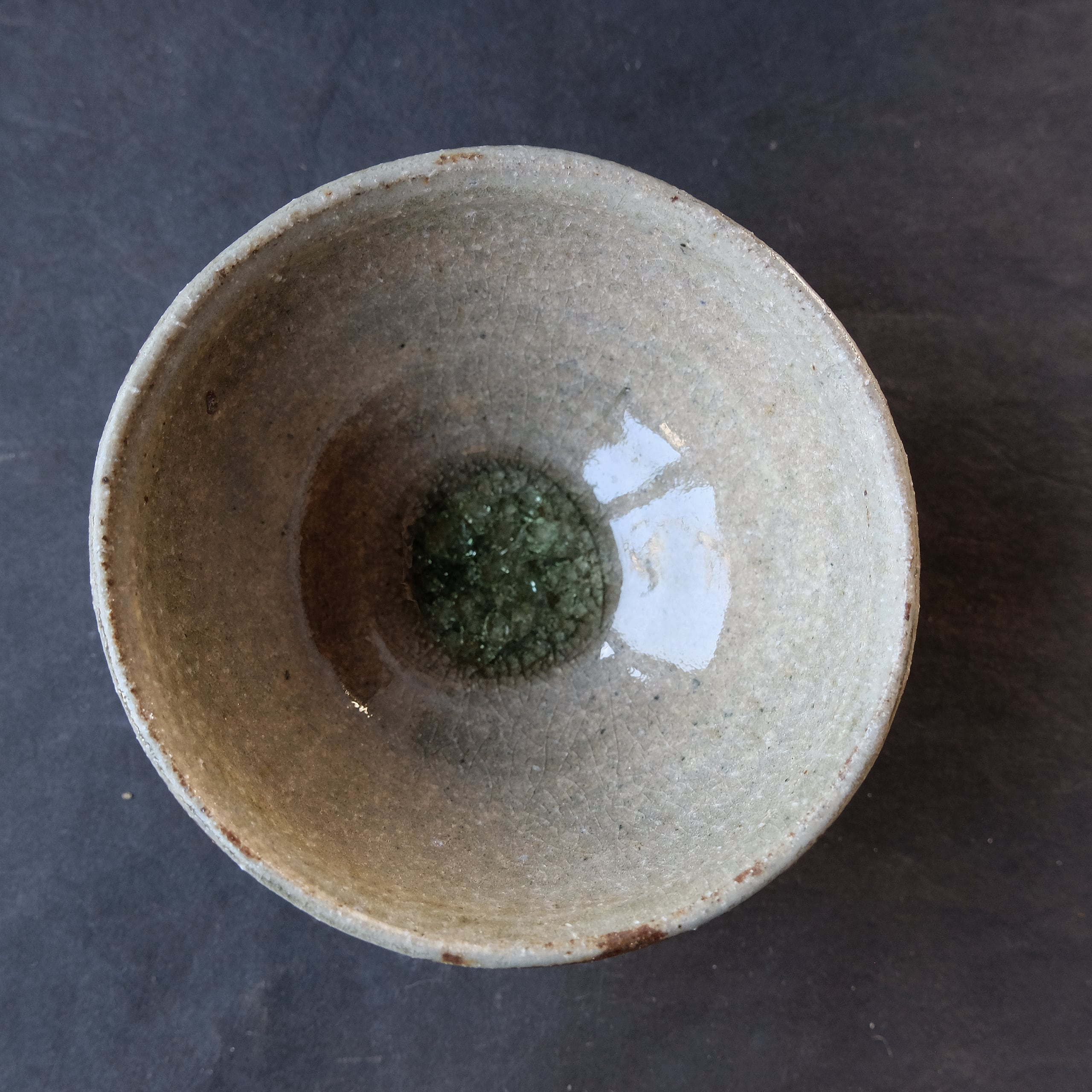 宝石のようにキラキラとした緑瓷釉のたまりが美しい飯椀です。