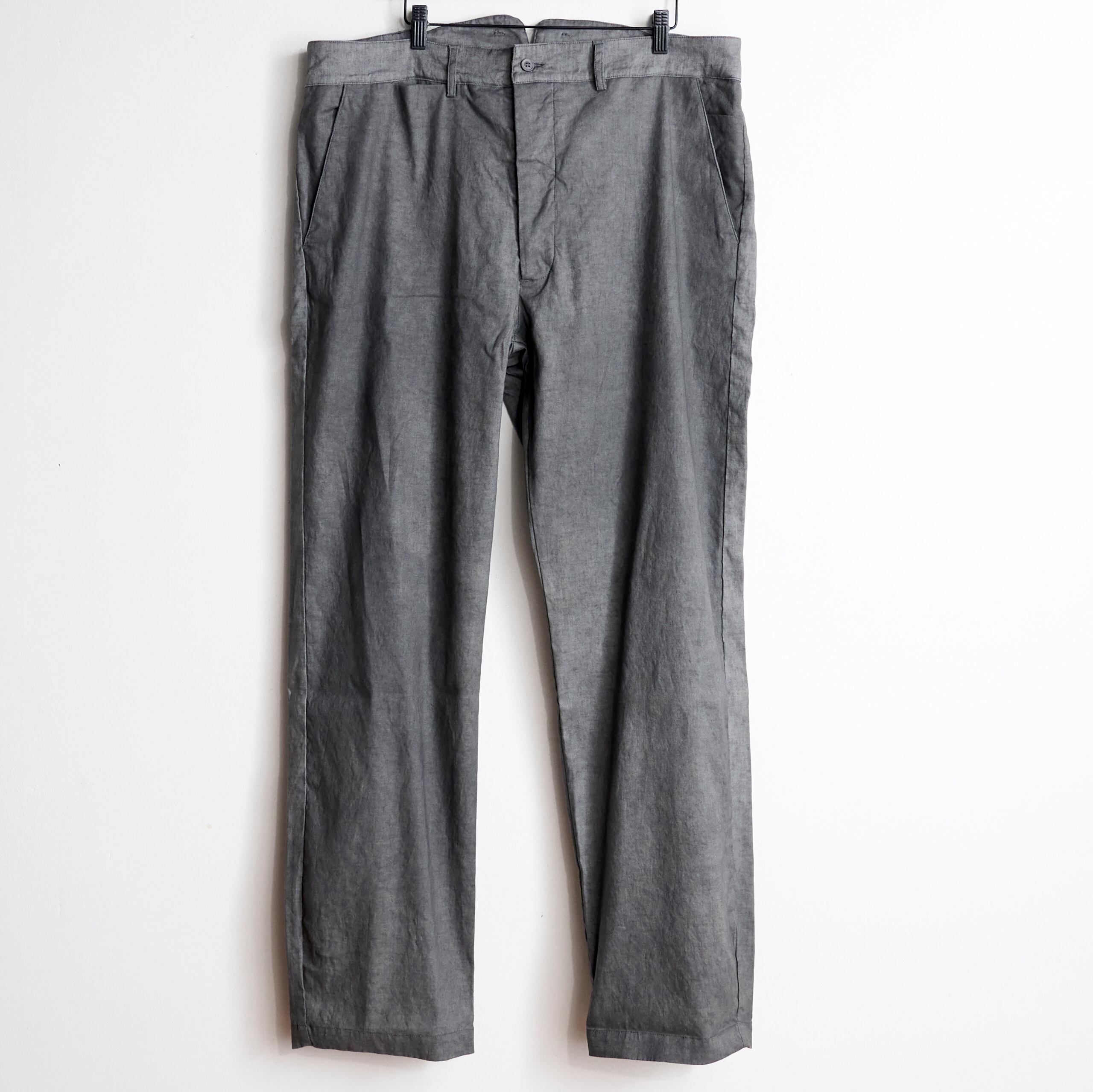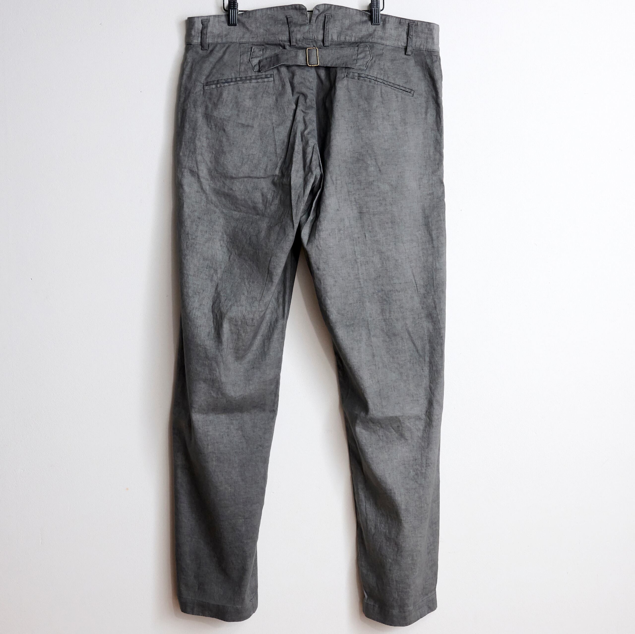 後ろ身頃は玉縁ポケットでミニマルなデザインとなっており、フロントはボタンフライ仕様となっております。