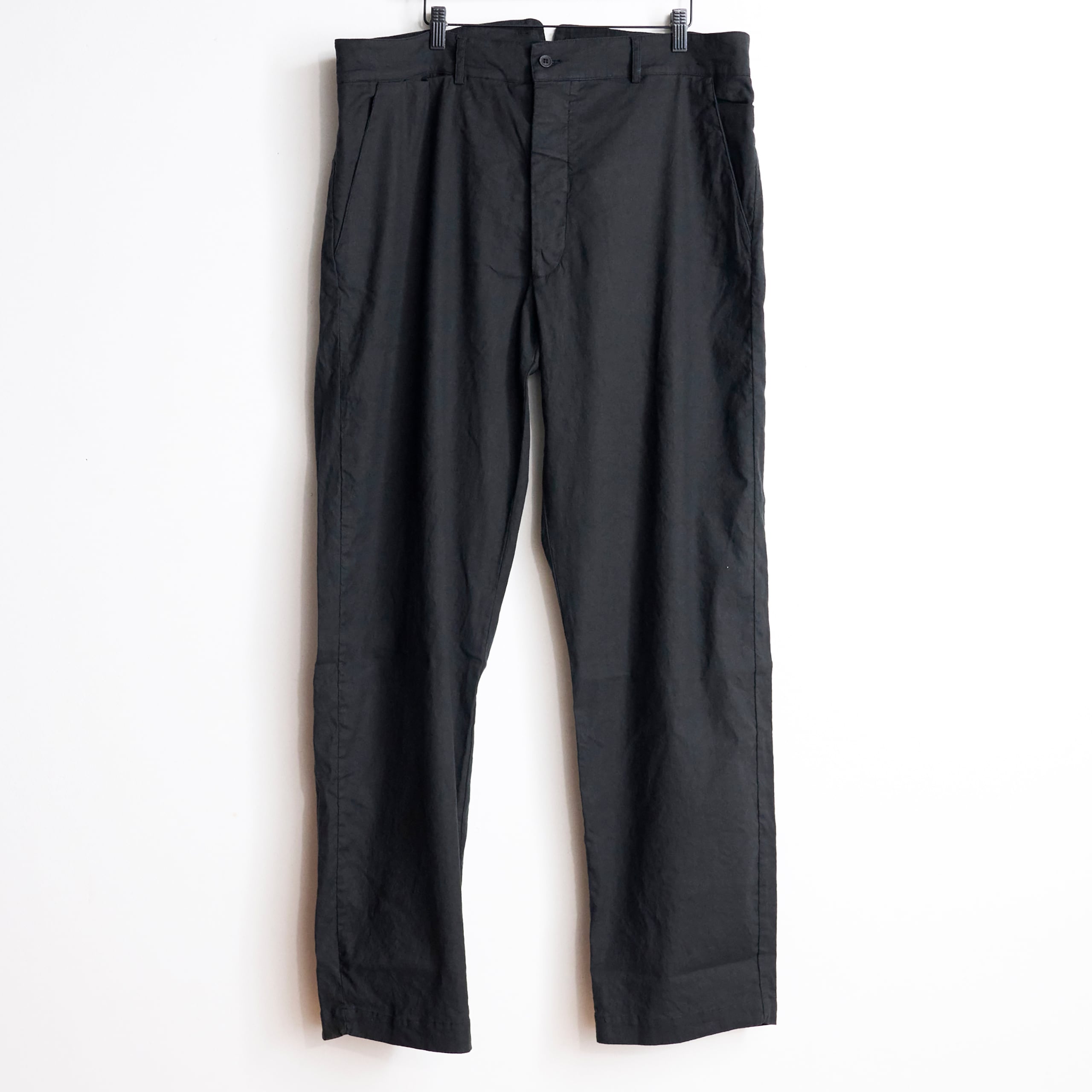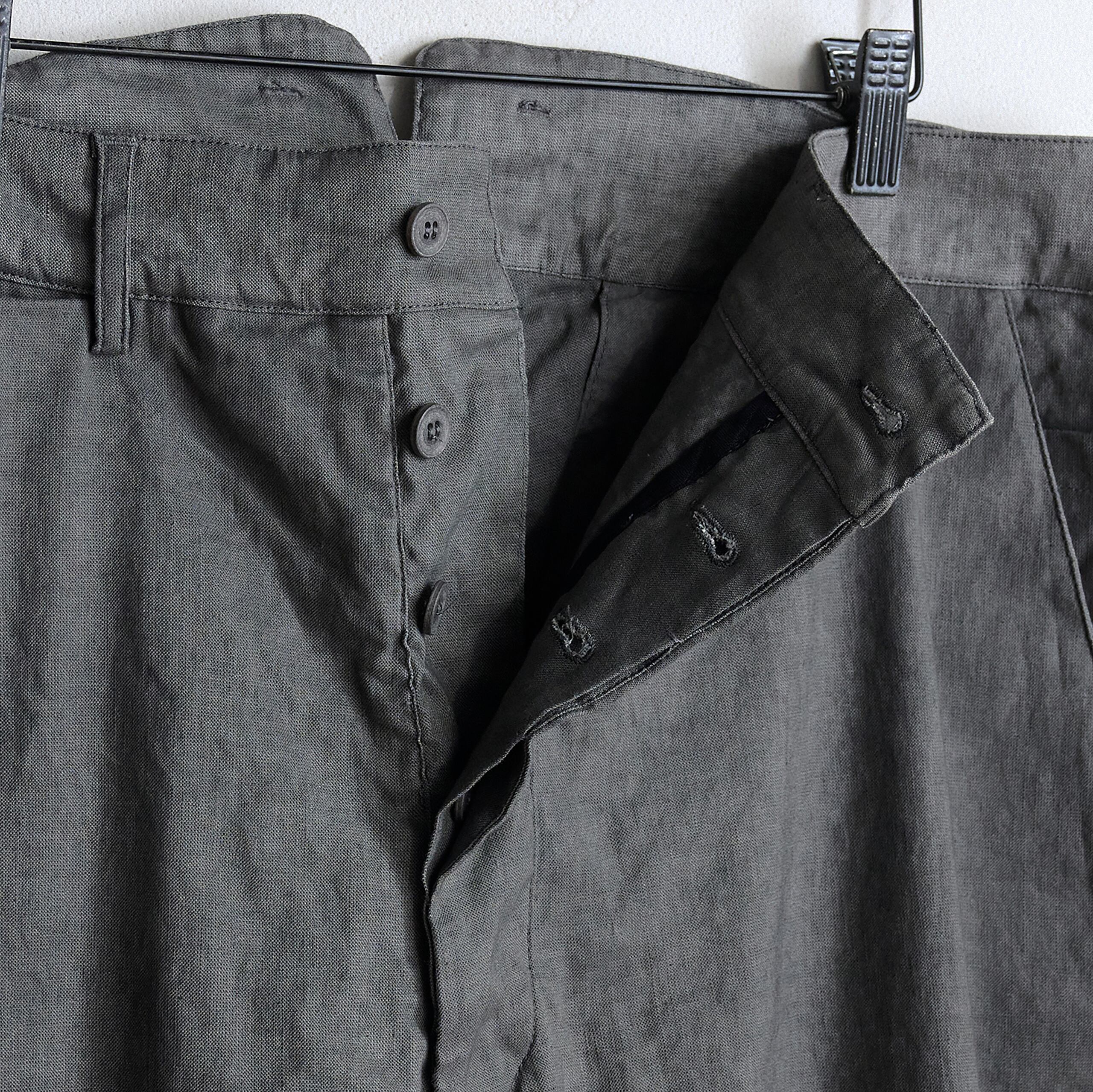 後ろ身頃は玉縁ポケットでミニマルなデザインとなっており、フロントはボタンフライ仕様となっております。