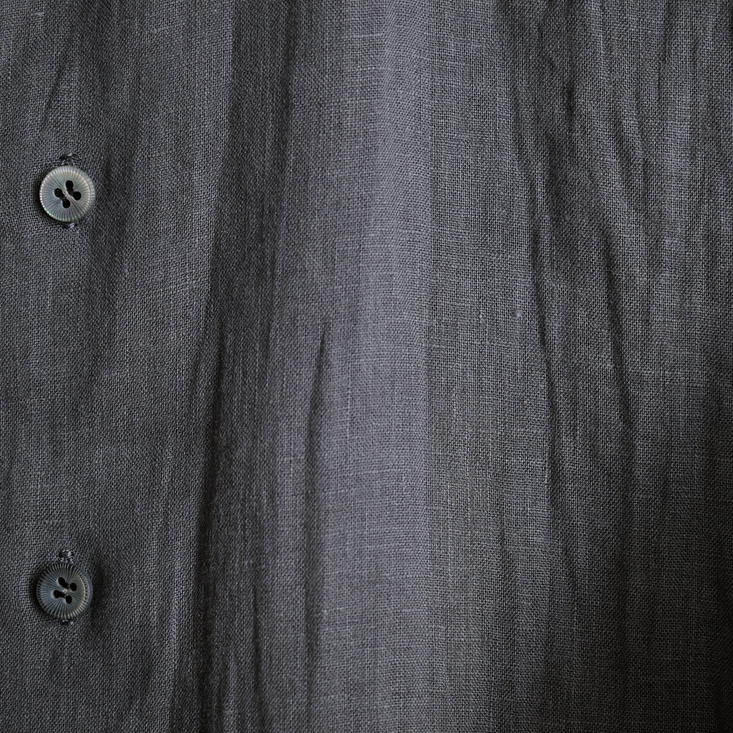 非常にこだわった立体的な美しいシルエットと、甘い印象になりすぎないように、バランスを取って作ったラウンドカラーが特徴の半袖シャツで、柔らかさとシャープさをバランス良く感じさせてくれます。ケバが少なく上質なフレンチリネンの糸を使って織り上げた薄手のキャンバス素材になります。上品な光沢と適度なハリ、特別な加工によるナチュラルな素材感が特徴です。