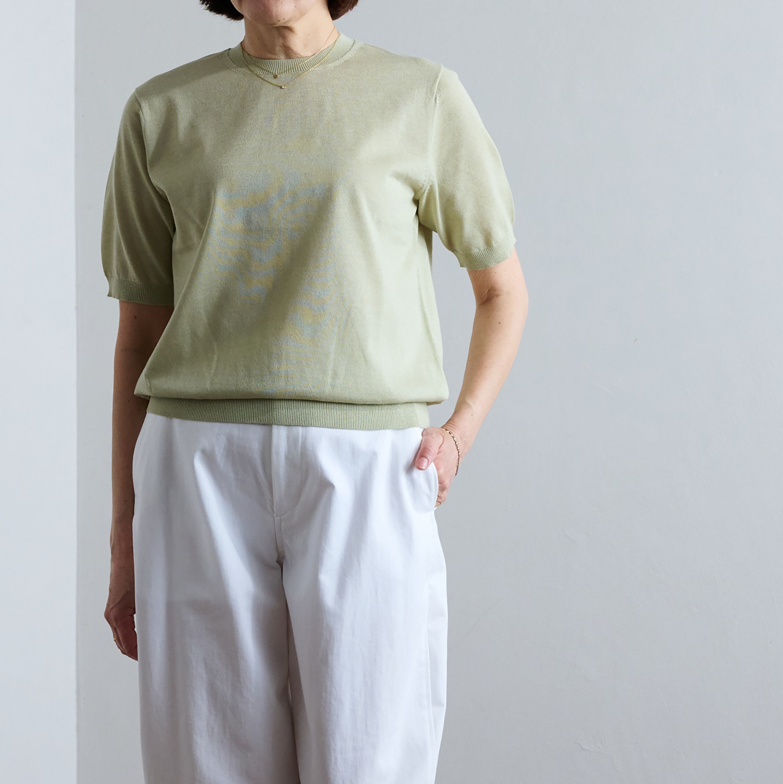 16ゲージ天竺編みをフルファッション*で丁寧に編み立てた 半袖クルーネック。 リサイクルポリエステルとトルコ産オーガニックコットンの混紡糸を使用。度目を限界まで詰めたドライタッチな表面。撥水(防汚)効果、速乾性に優れた、デイリーに着用できる一着。ややゆとりのあるサイジング。