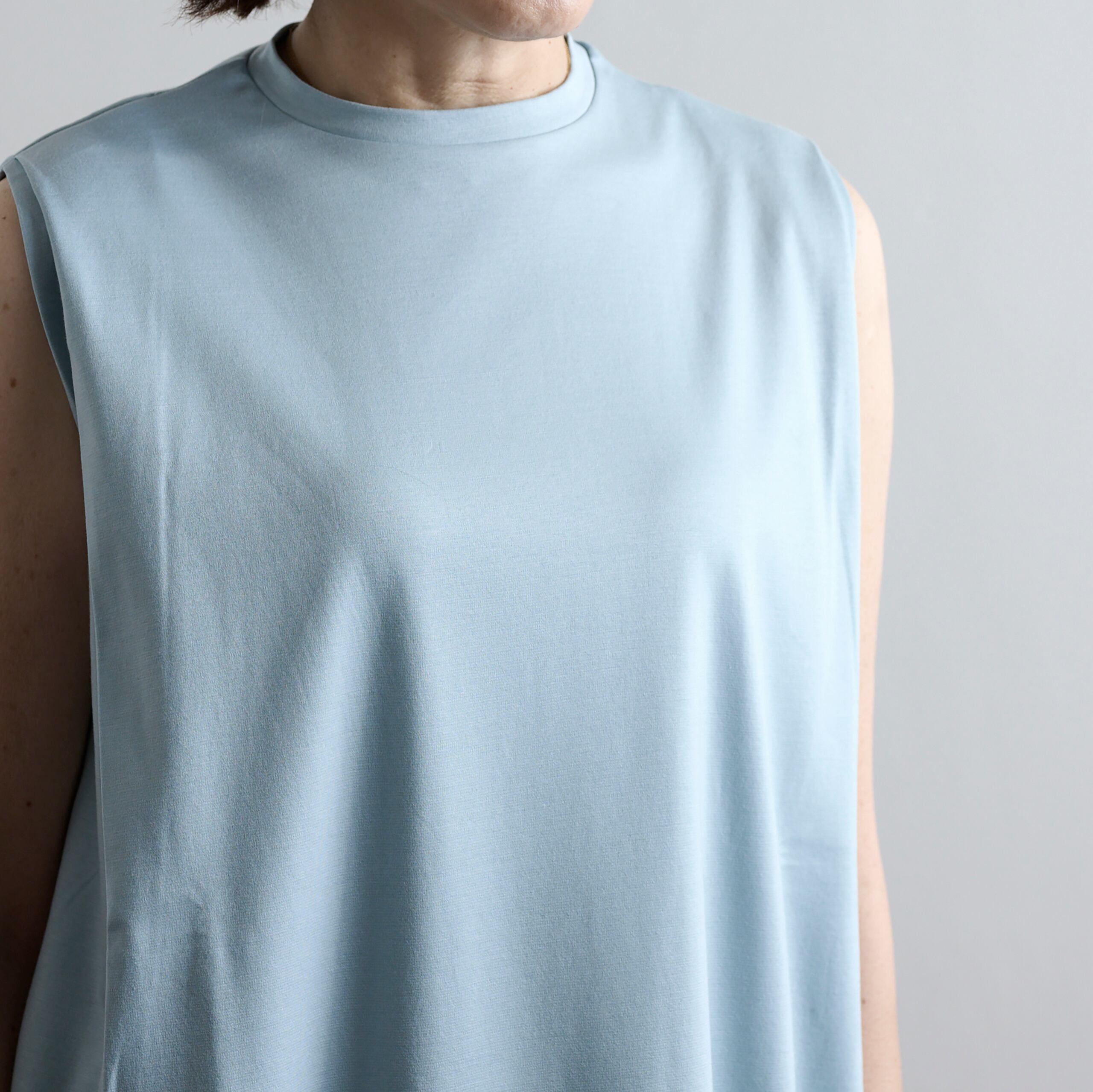 細番手のコットンをハイゲージで編み、光沢感と程よいストレッチの効いたタックショルダーワンピース。二の腕をすっきりとみせる立体感のあるデザイン。ポケット付き。