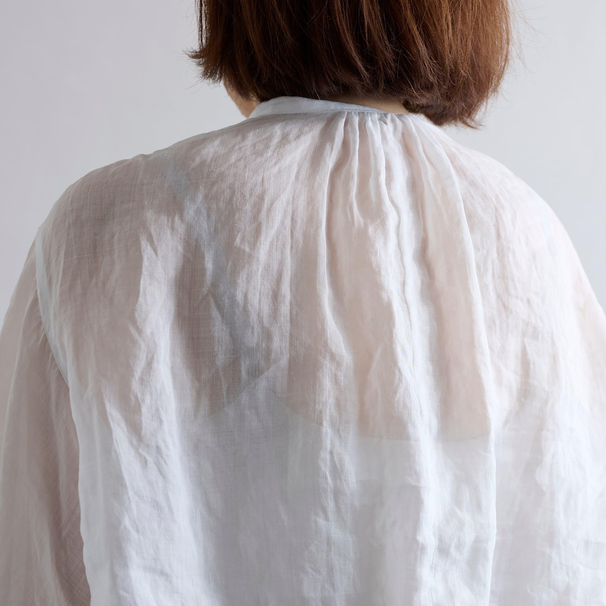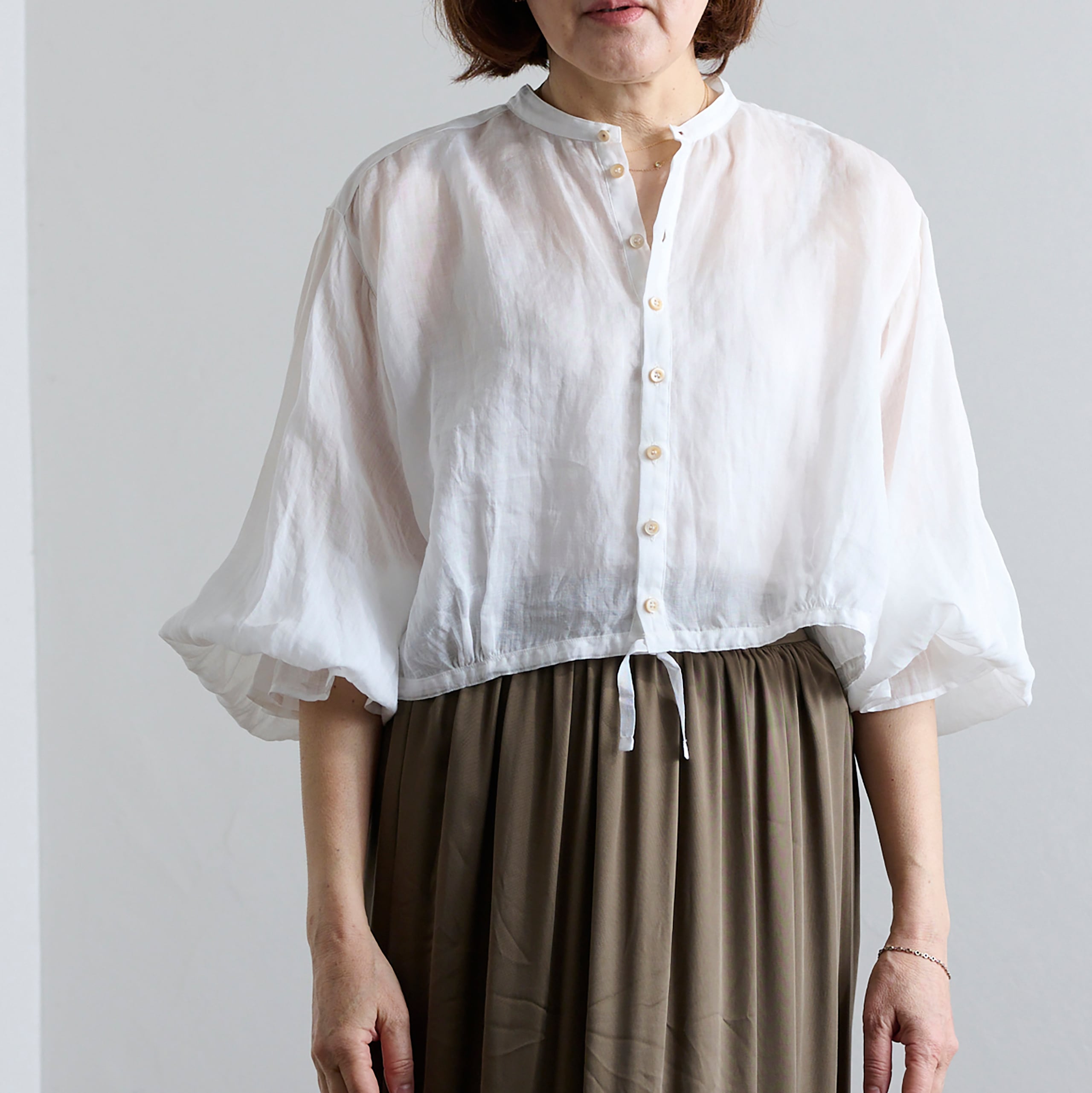 前を閉じで、ブラウスとして着ていただいても良いですし、ワンピースやブラウスなどの上に羽織っていただいて、カーディガンのような立ち位置でお使いいただくのもオススメです。