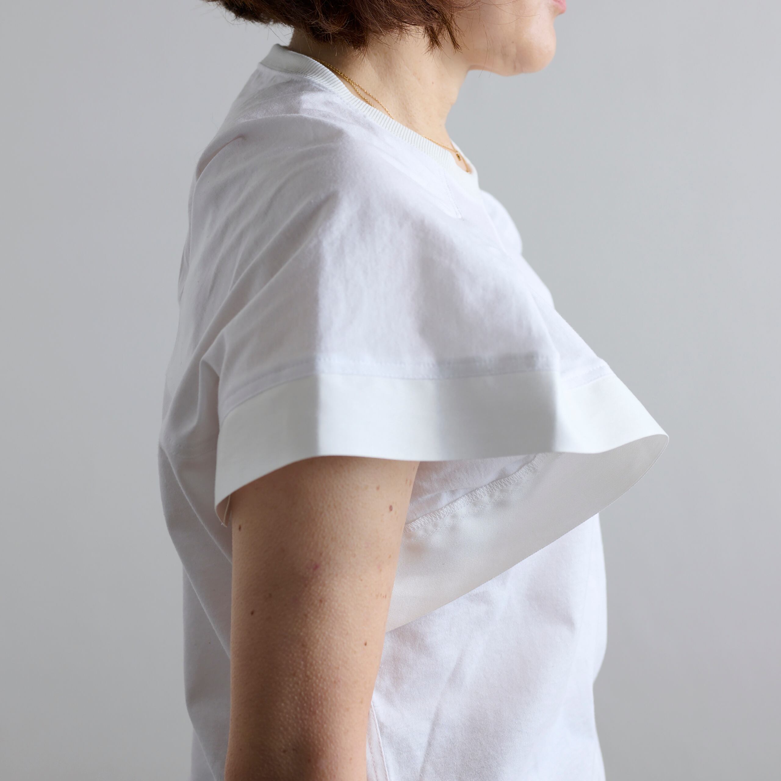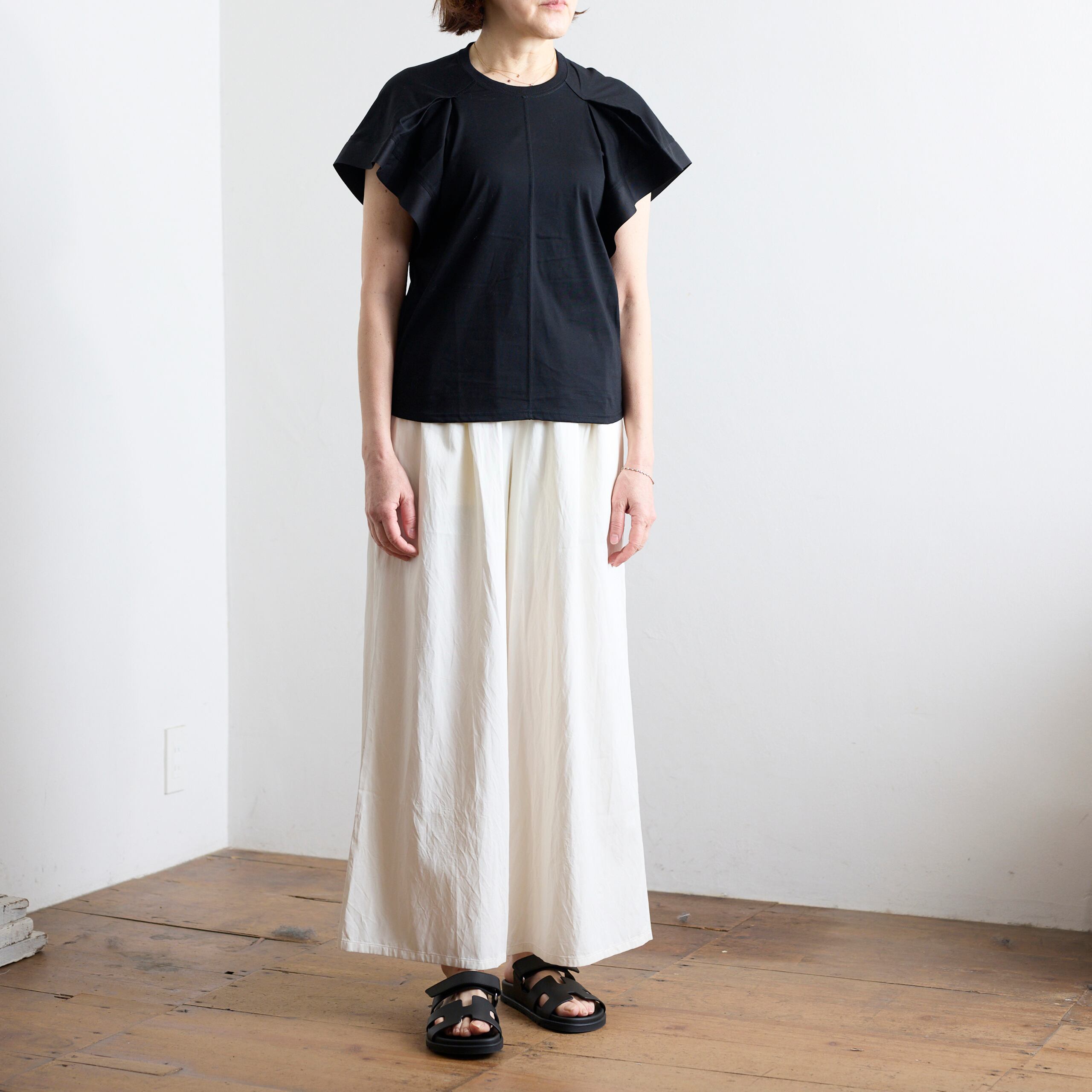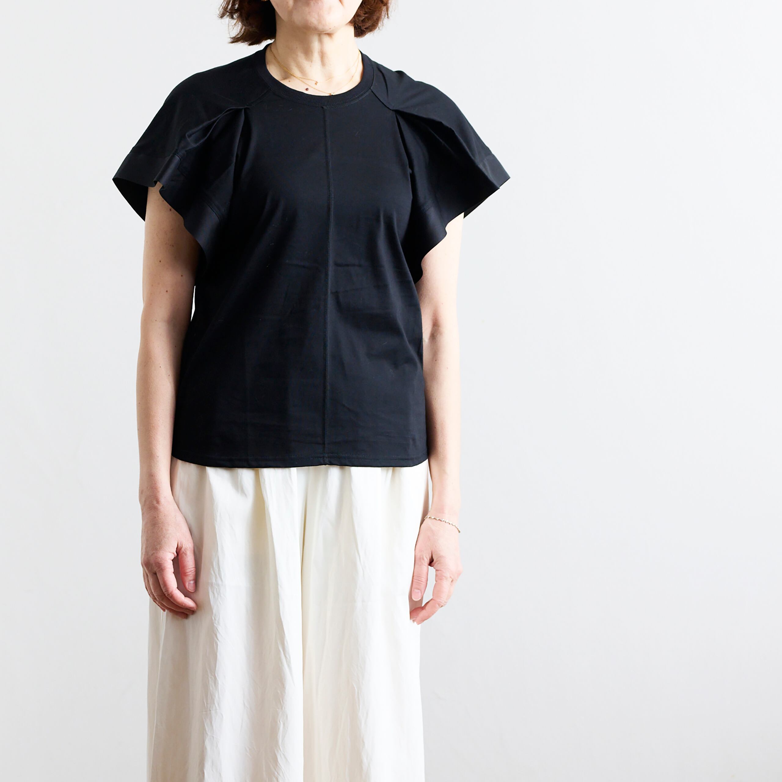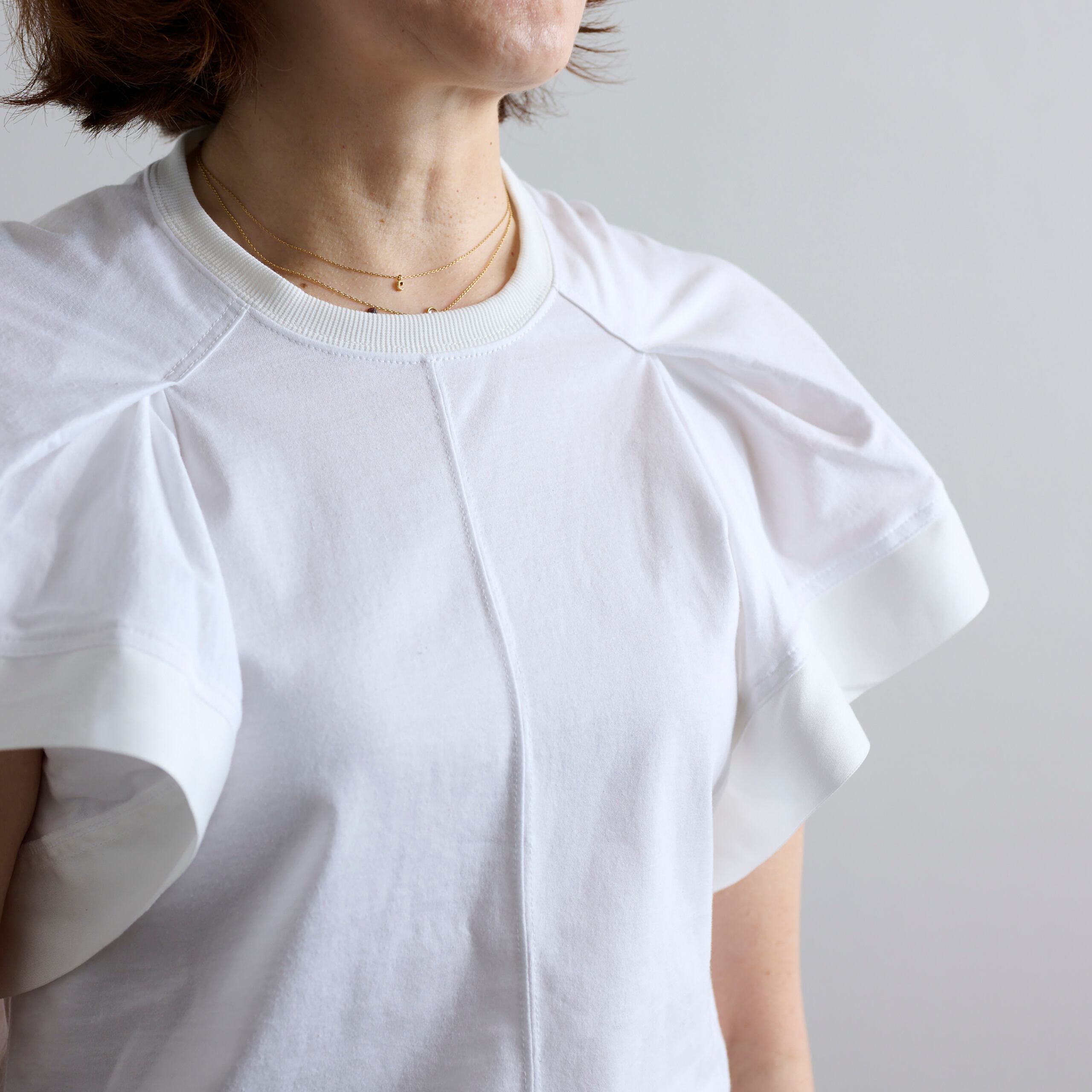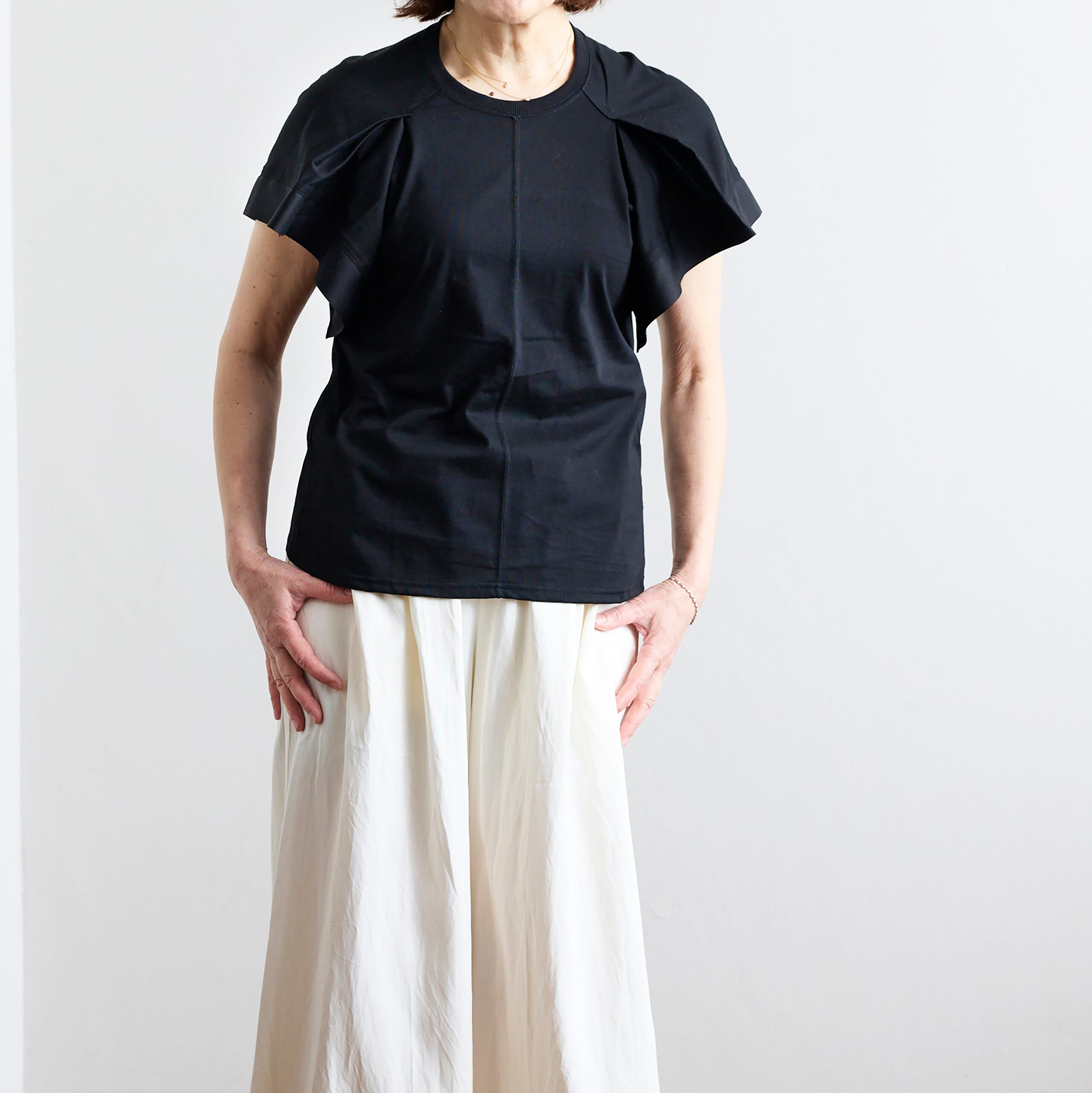 特徴的な肩のディテールが目を惹く、アート感のあるTシャツ。肩に施されたタックにより動くたびに袖が美しく揺れます。直線的な身頃との対比が洗練されたバランスを生み、着る人の感性を引き立てます。