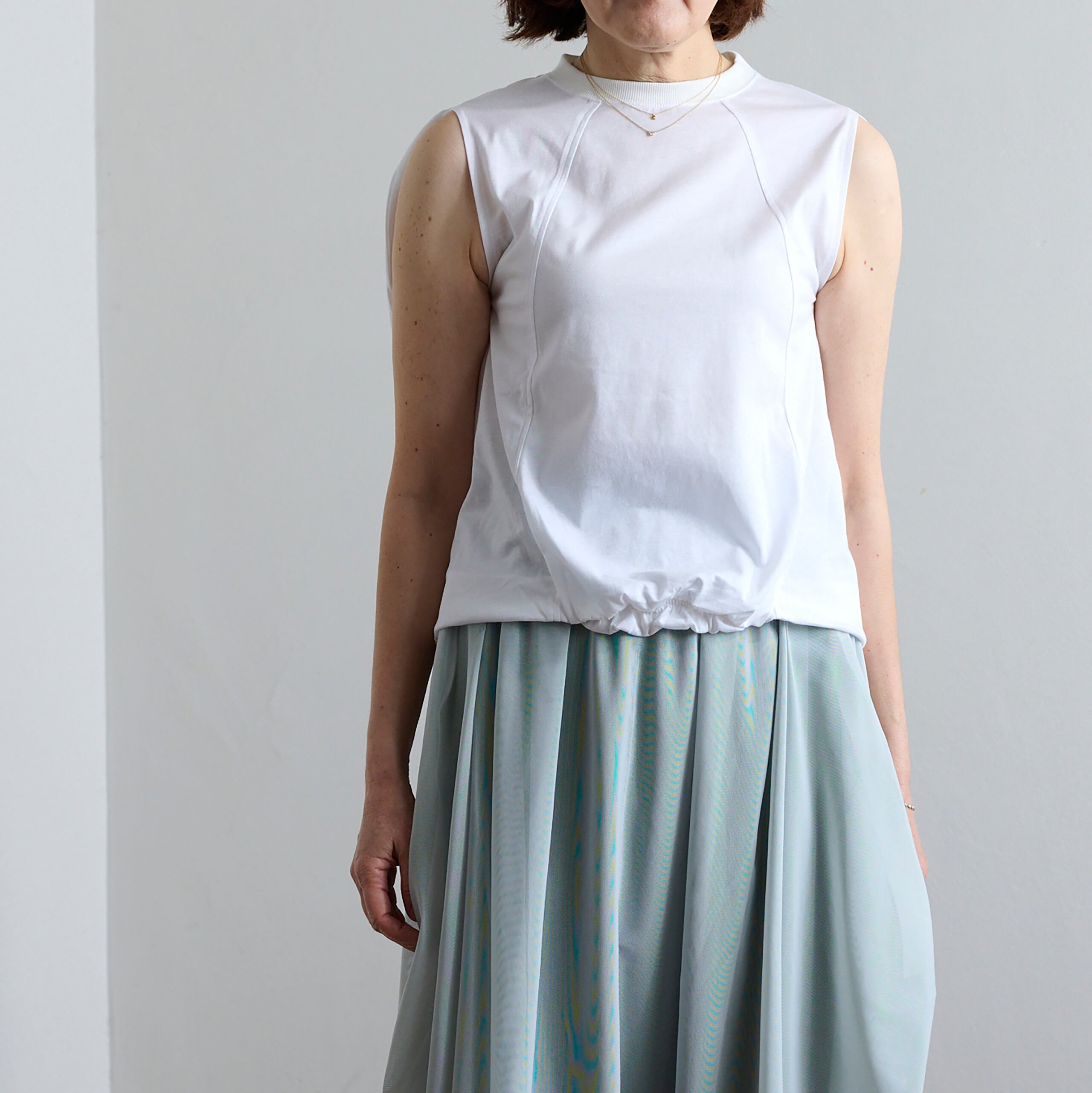縦に入った立体的な切り替えラインが、ミニマルな中にも洗練された印象を与えるトップス。