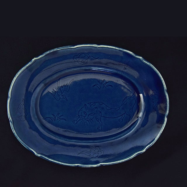 須藤拓也 TAKUYA SUDO 瑠璃陰刻 楕円輪花皿