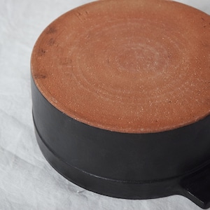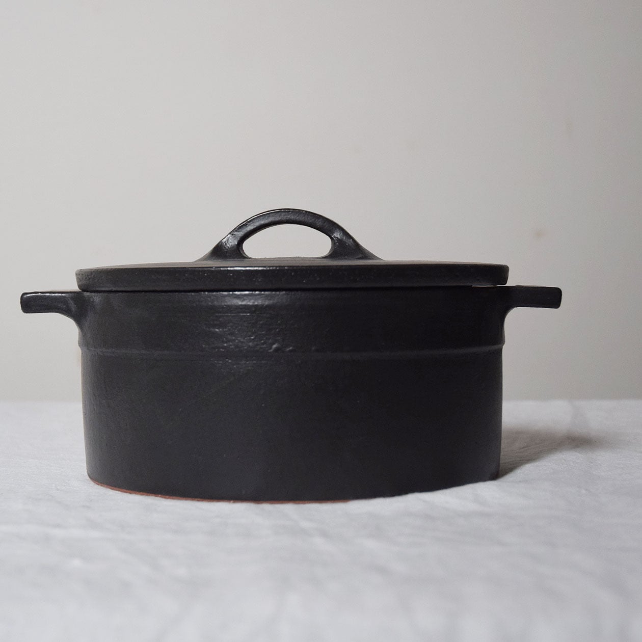 鈍い光沢のココットは一見すると鋳物にも見える黒い陶器によるシチュー鍋です。
