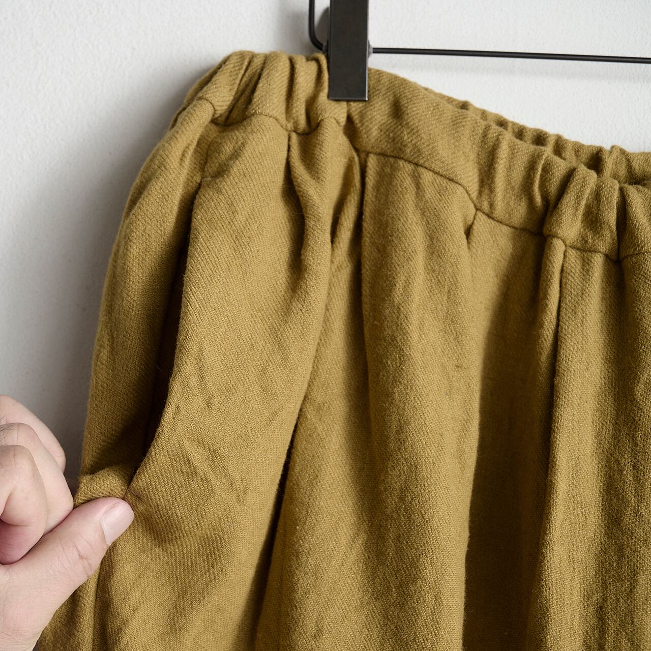 西アジア、中央アジアなどで履かれていたものがモチーフのゆったりとした幅広のパンツとなります。分量感のあるウエスト周りから、裾へ向かう美しいテーパードラインが特徴です。