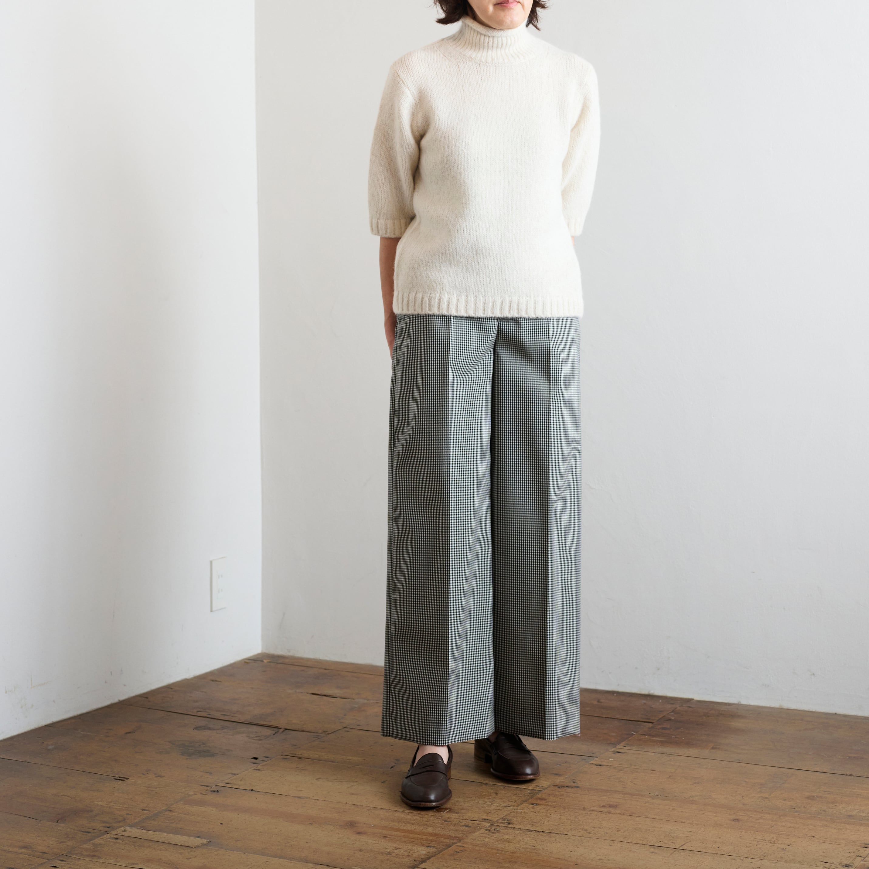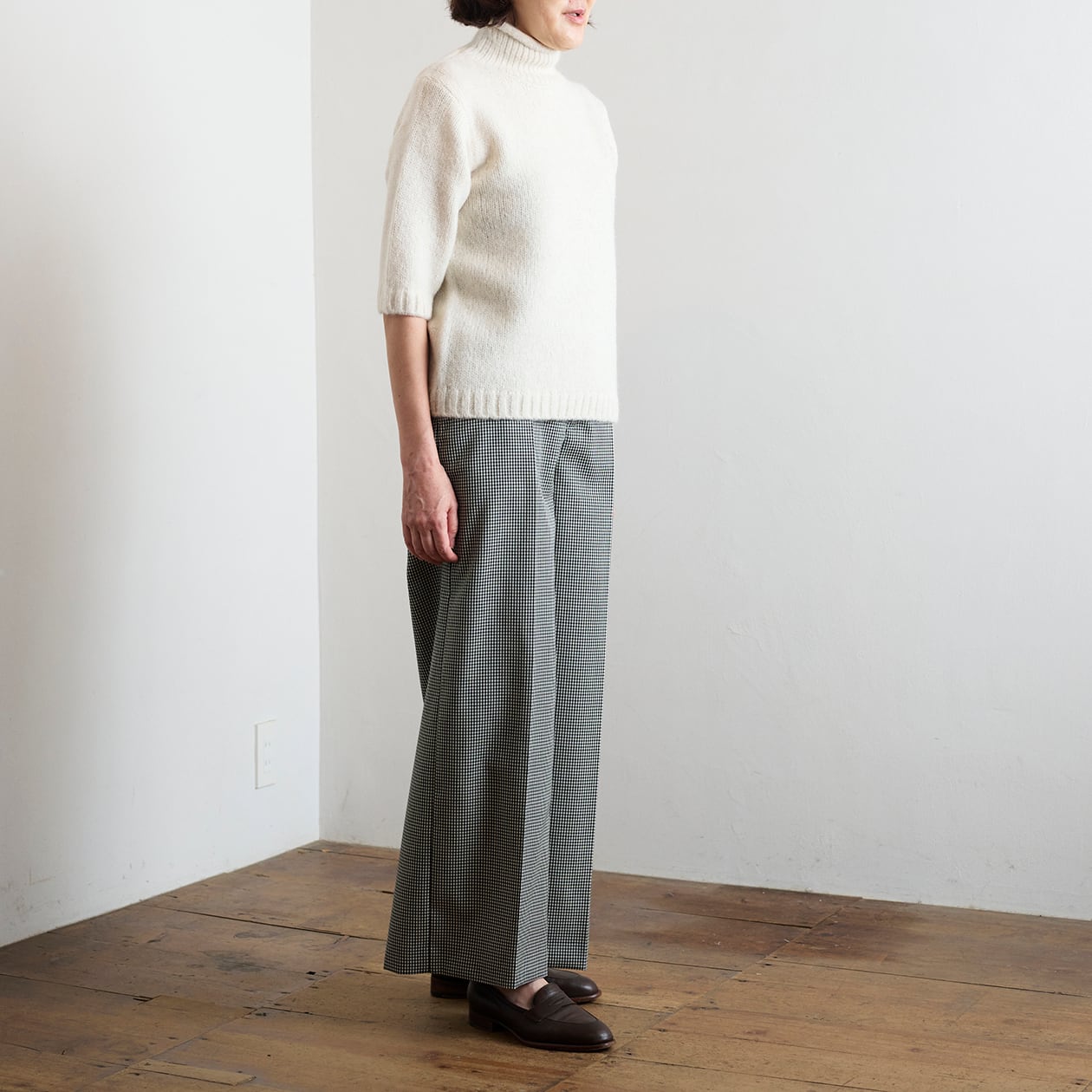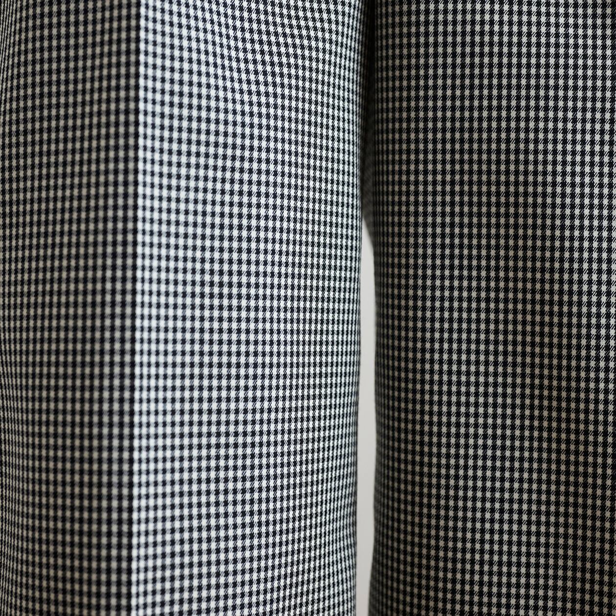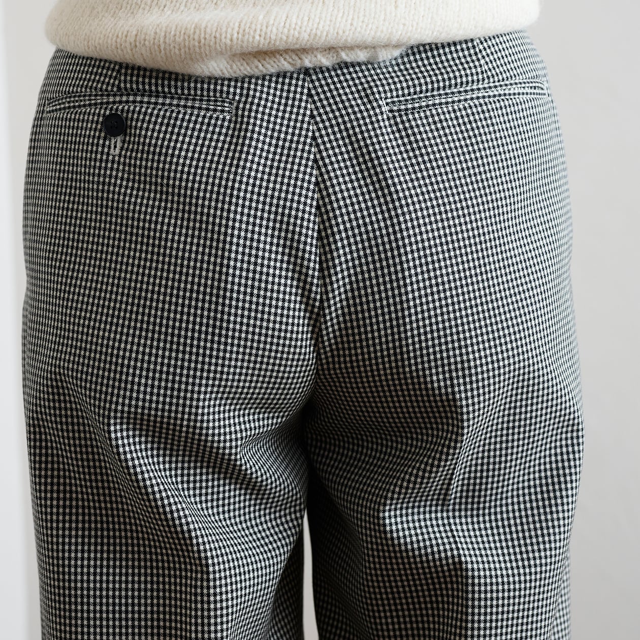 梳毛糸2/72の糸を使用し、高密度に織りあげた先染めギャバ素材。仕上げ加工の最終工程でウレタン含浸加工をすることで反発感のある風合いにし、しわにもなりにくく仕上がっています。ハイゲージニットやジャケットにあわせて大人のリラックススタイルを楽しめる1枚です。