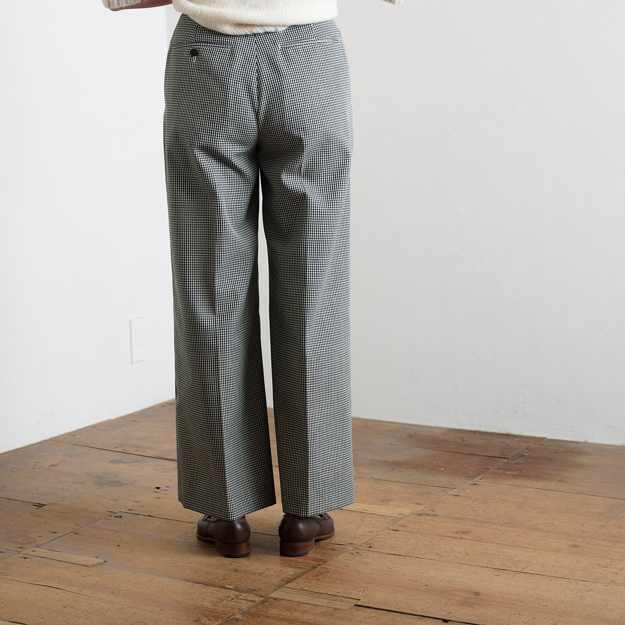 張り感のある素材をノータックの太目なバギーパンツに落とし込んだワイドパンツです。どことなくクラシックなイメージです。