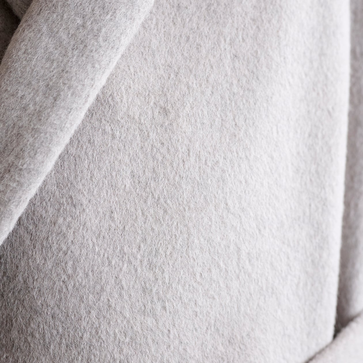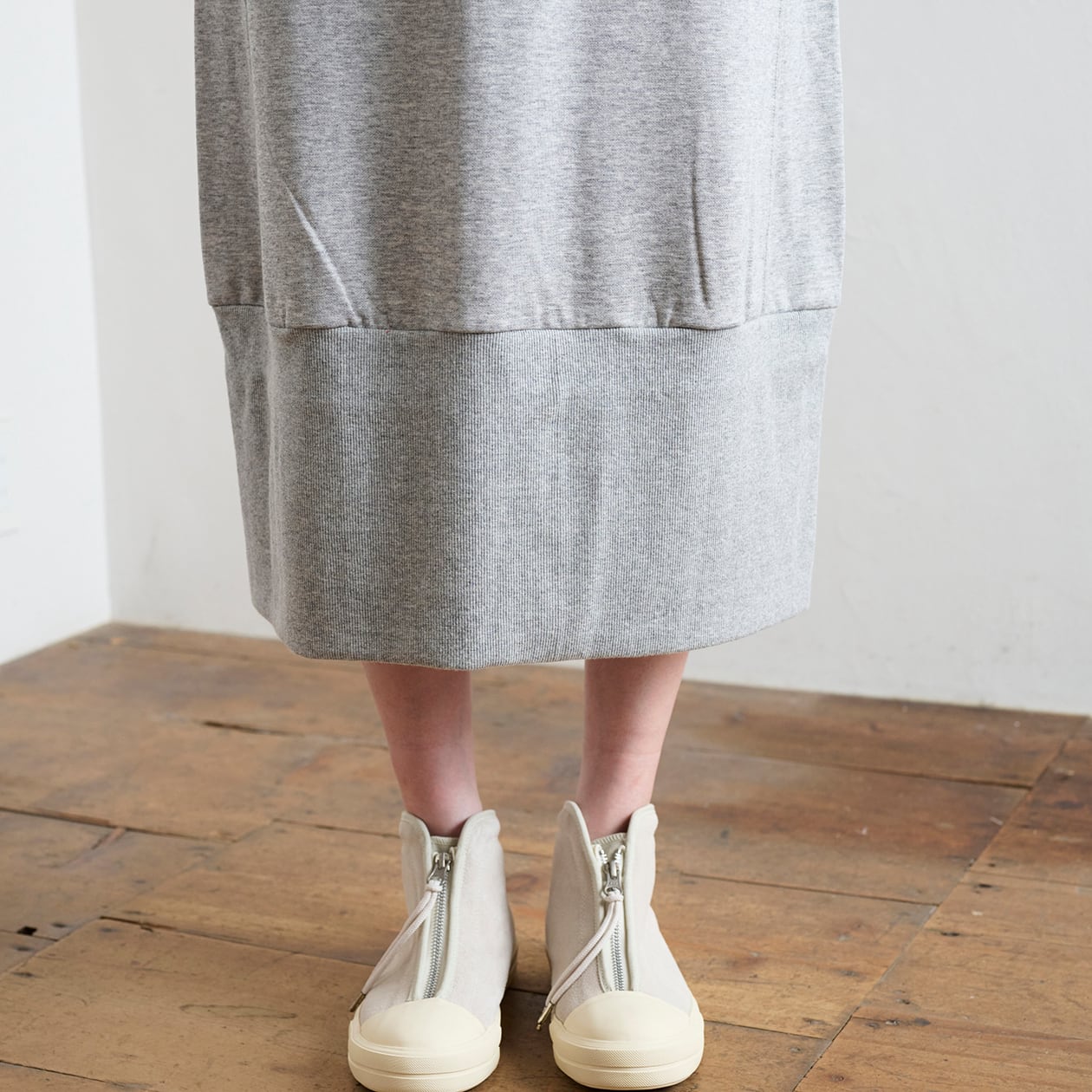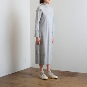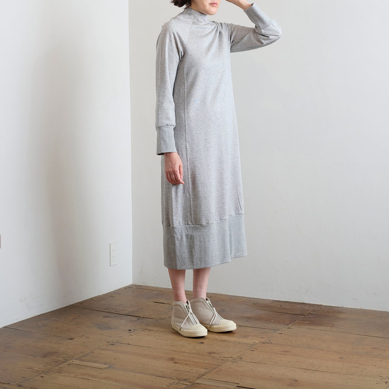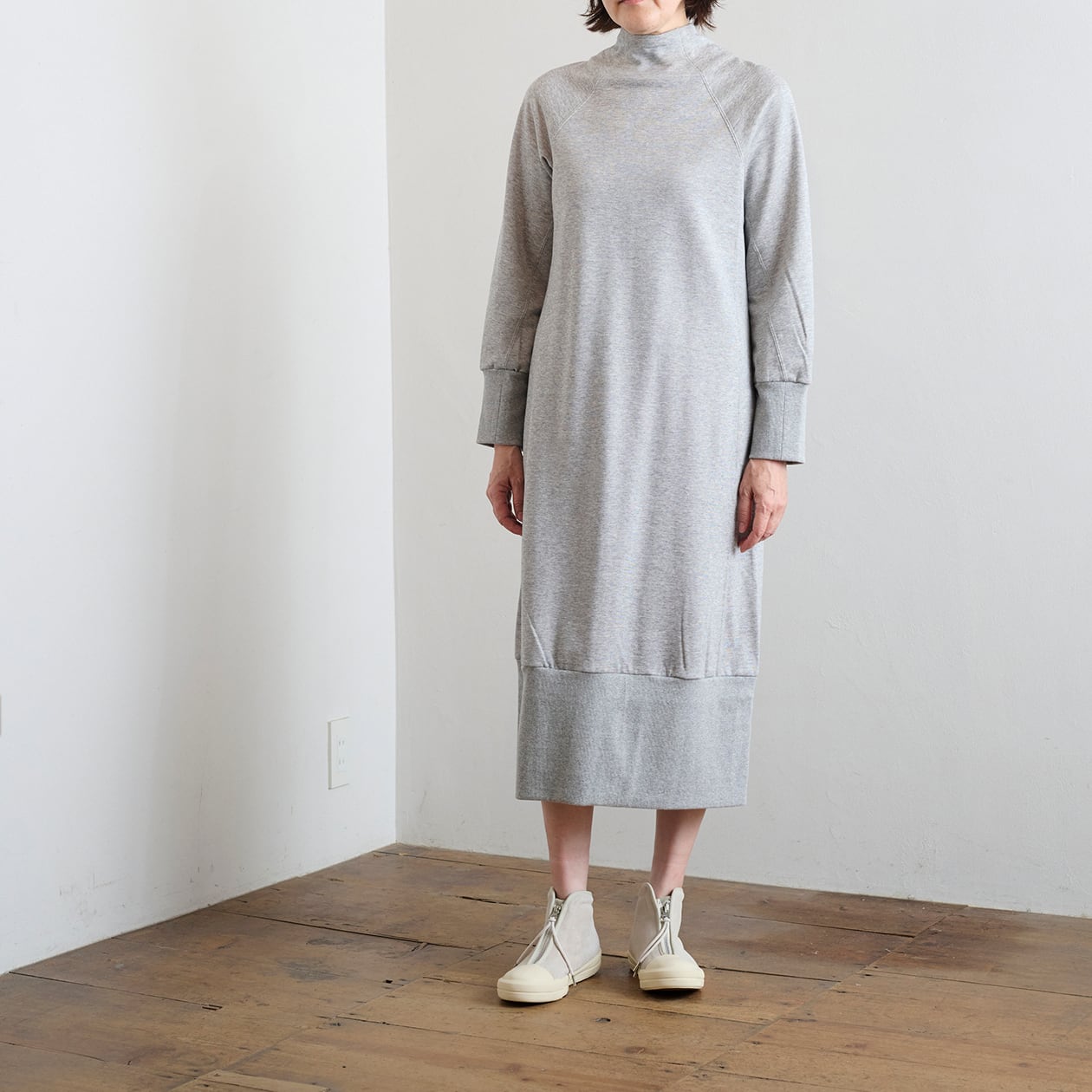 非常に柔らかな風合いの裏毛を使用したロングワンピース。立体的に少し高くした襟とラグランスリーブが特徴的。ステッチで縫い目をフラットにし、リブをあしらうことにより、カジュアルに仕立てています。