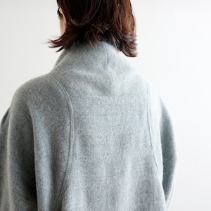 大きなシルエットながらも、袖が内側に入っている為、肩幅を華奢に見せます。裾にはタックが入っており、バルーンのようなシルエットになっています。
