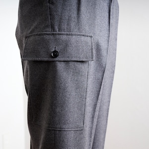 テーパードのきいたゆったりめのタックパンツにフラップポケットをあしらったミニマルな印象のミリタリートラウザー。しっかりとしたぬめり感となめらかさのあるフラノ素材を使用。斜め方向に伸縮性があります。