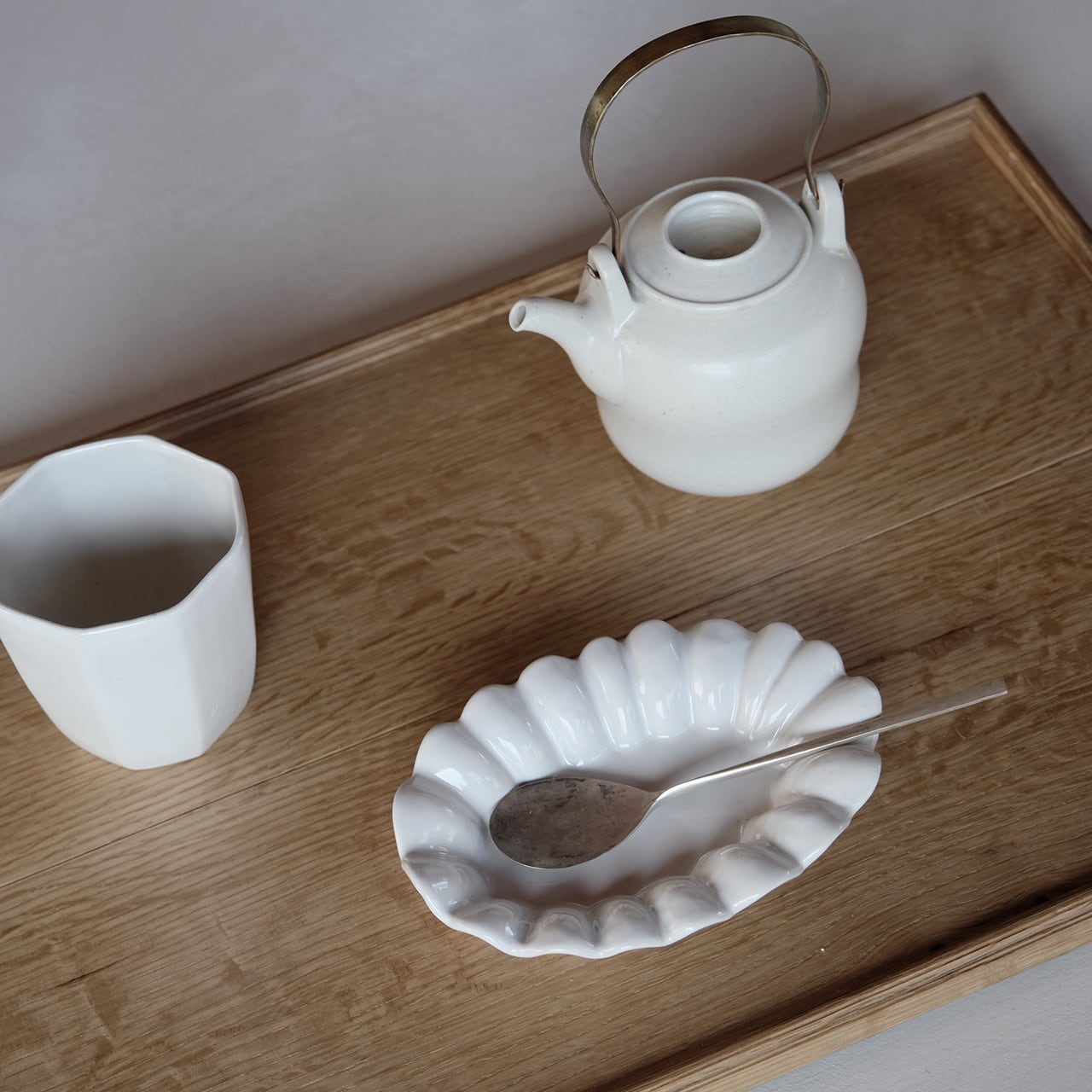 三保の松原の松を灰にして作られた釉薬を使った急須はくびれのある胴部分がユニークな意匠です。マットな表情も質感の高い仕上がりとなっています。