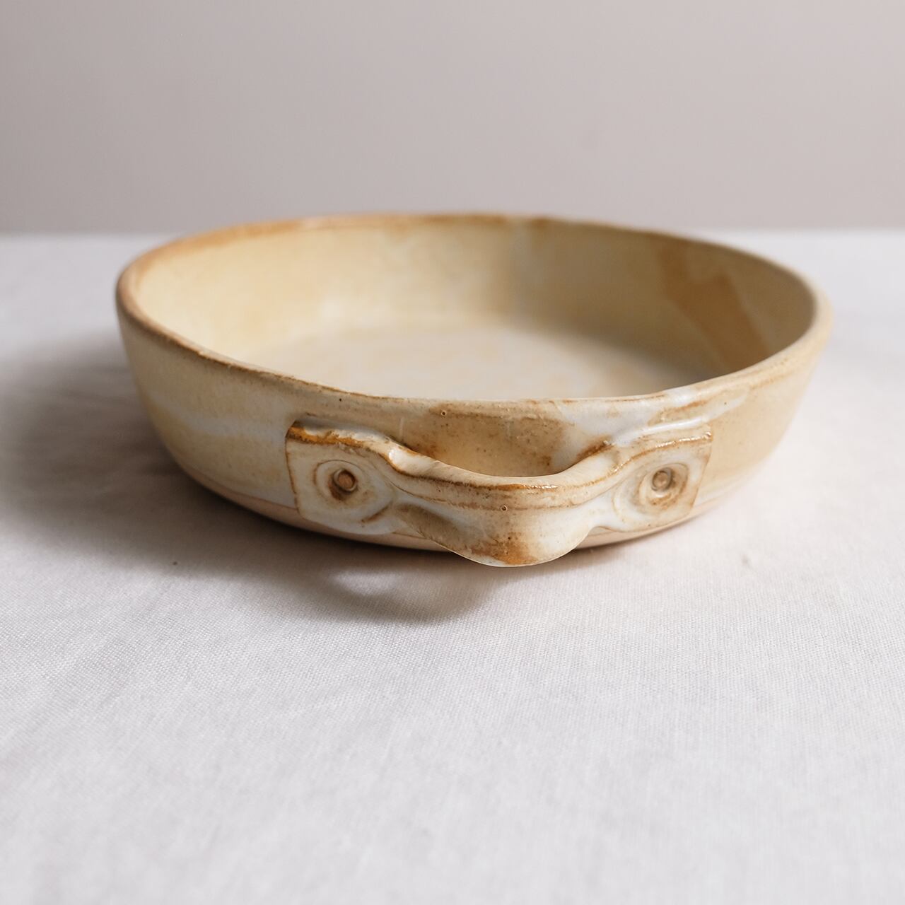 直火も使える、釉薬の流れや濃淡で生まれるアンティーク調の表情が味わい深いのあるの耐火のオーバルパンです。