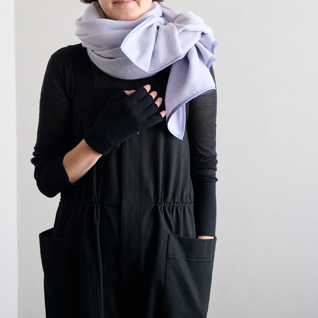 凹凸感あるシアー感、巻いたときのドレープ性、通気性を実現するためにホールガーメントの編み機で編み立てたニットスカーフです。本体をリンクス編み、ヘムを袋編みで仕上げることで、リンクス編みの立体的な透け感、袋編みのフラットでクリーンな印象を併せ持つ美しい製品に仕上がりました。