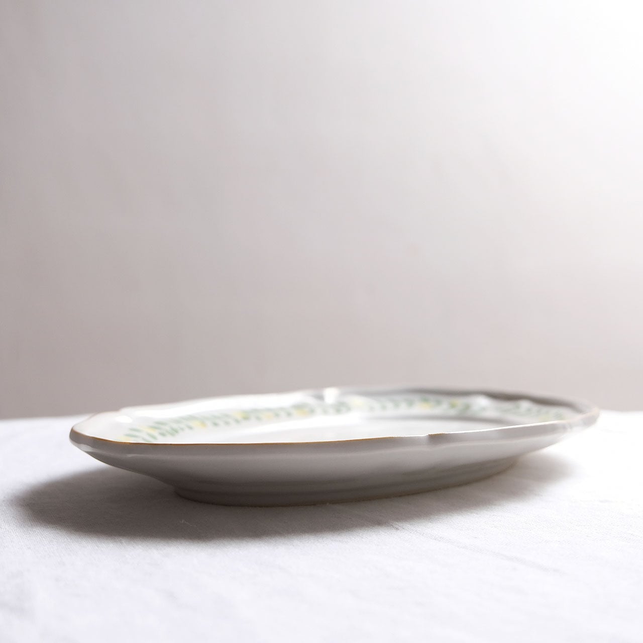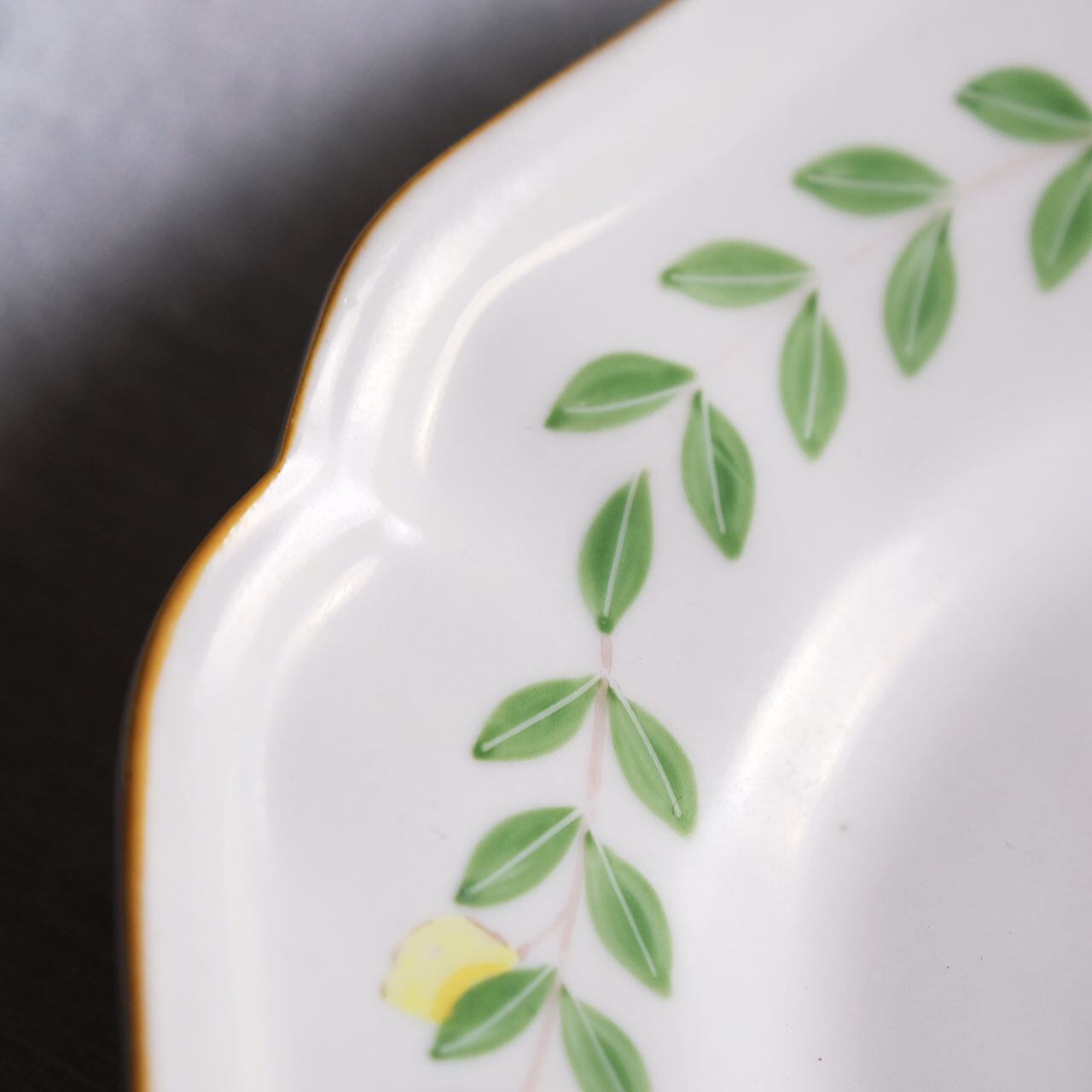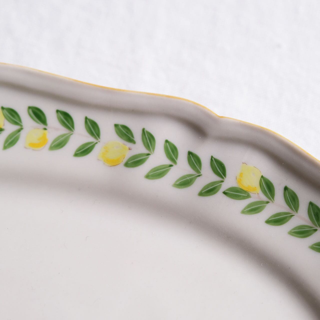 檸檬絵付けの花型リムオーバル皿です。定番の花リムの部分に檸檬の絵付けがあしらってあります。その動きがオーバルの形状に相まってアンティークでリッチな表情です。